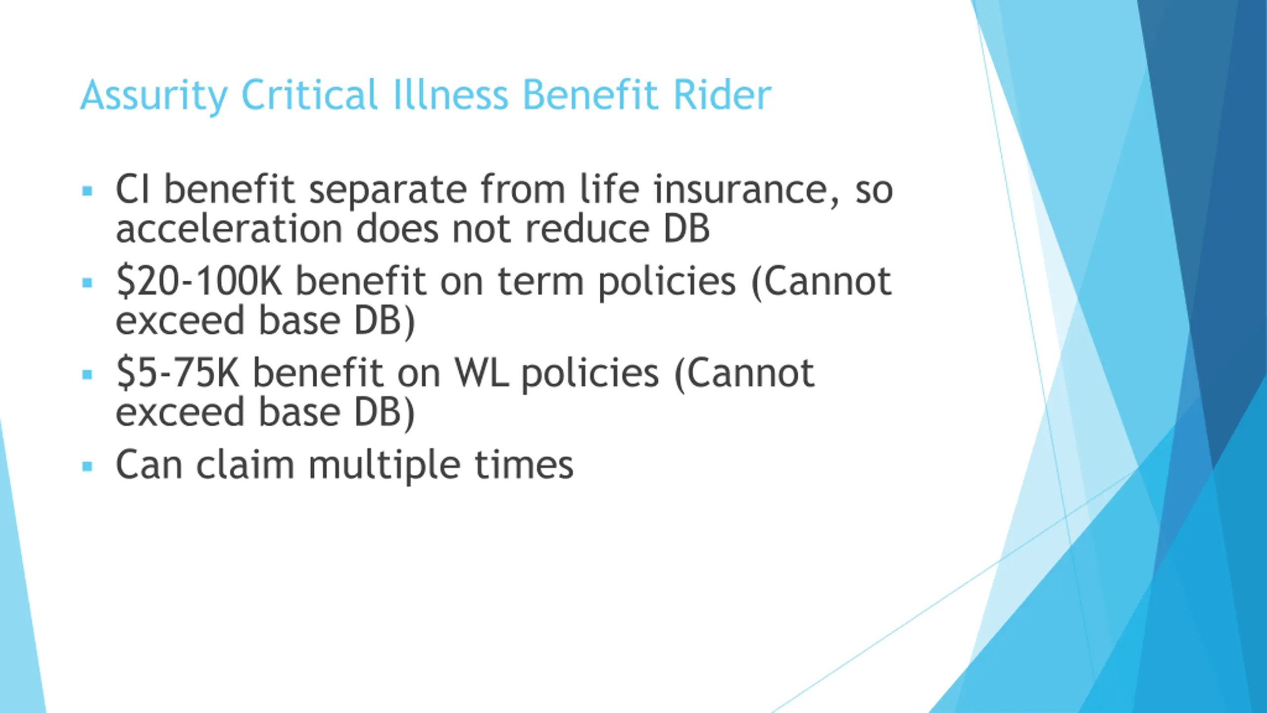 Assurity Critical Illness Benefit Rider CI benefit separate from life insurance, so acceleration does not reduce DB $20-100K benefit on term policies (Cannot exceed base DB) $5-75K benefit on WL policies (Cannot exceed base DB) Can claim multiple times