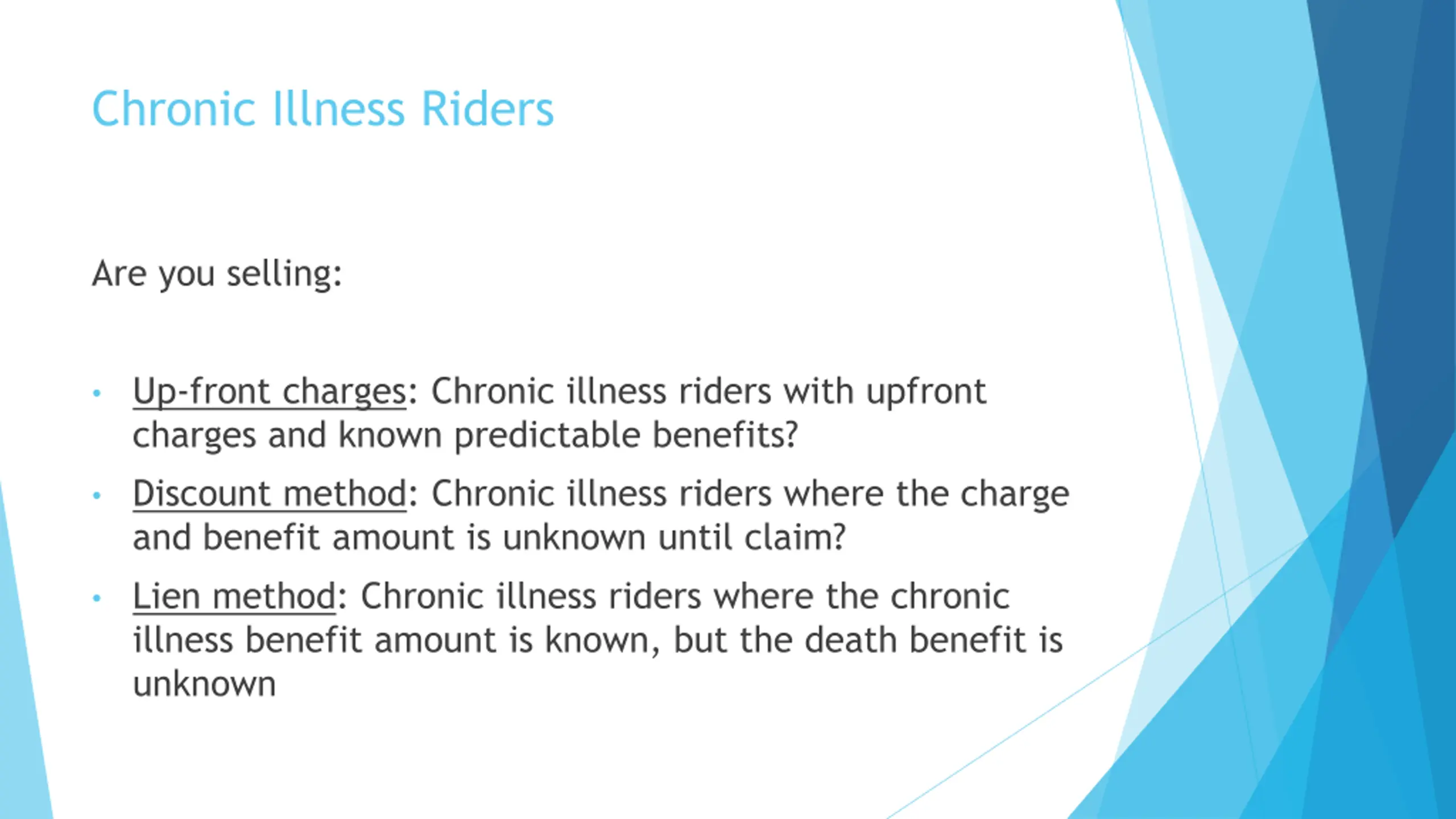 Chronic Illness Riders Are you selling: Up-front charges: Chronic illness riders with upfront charges and known predictable benefits? Discount method: Chronic illness riders where the charge and benefit amount is unknown until claim? Lien method: Chronic illness riders where the chronic illness benefit amount is known, but the death benefit is unknown