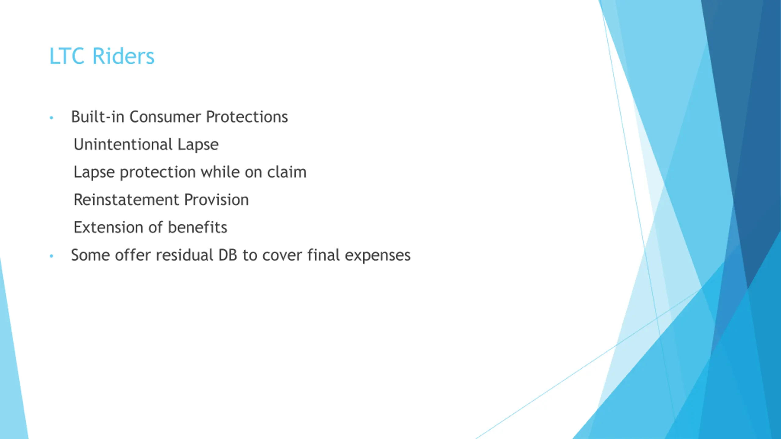 LTC Riders Built-in Consumer Protections Unintentional Lapse Lapse protection while on claim Reinstatement Provision Extension of benefits Some offer residual DB to cover final expenses