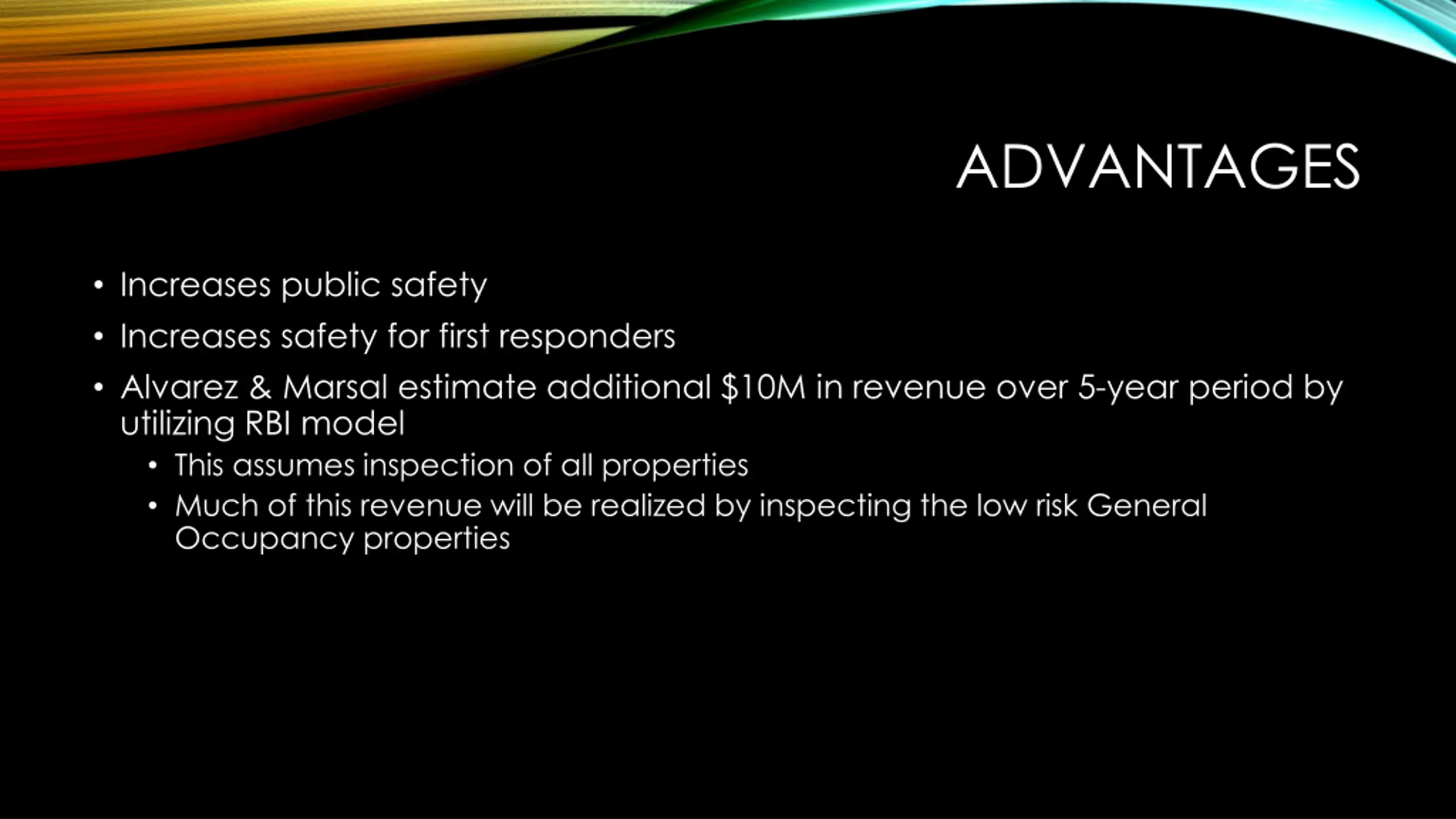 ADVANTAGES Increases public safety Increases safety for first responders Alvarez & Marsal estimate additional $10M in revenue over 5-year period by utilizing RBI model This assumes inspection of all properties Much of this revenue will be realized by inspecting the low risk General Occupancy properties