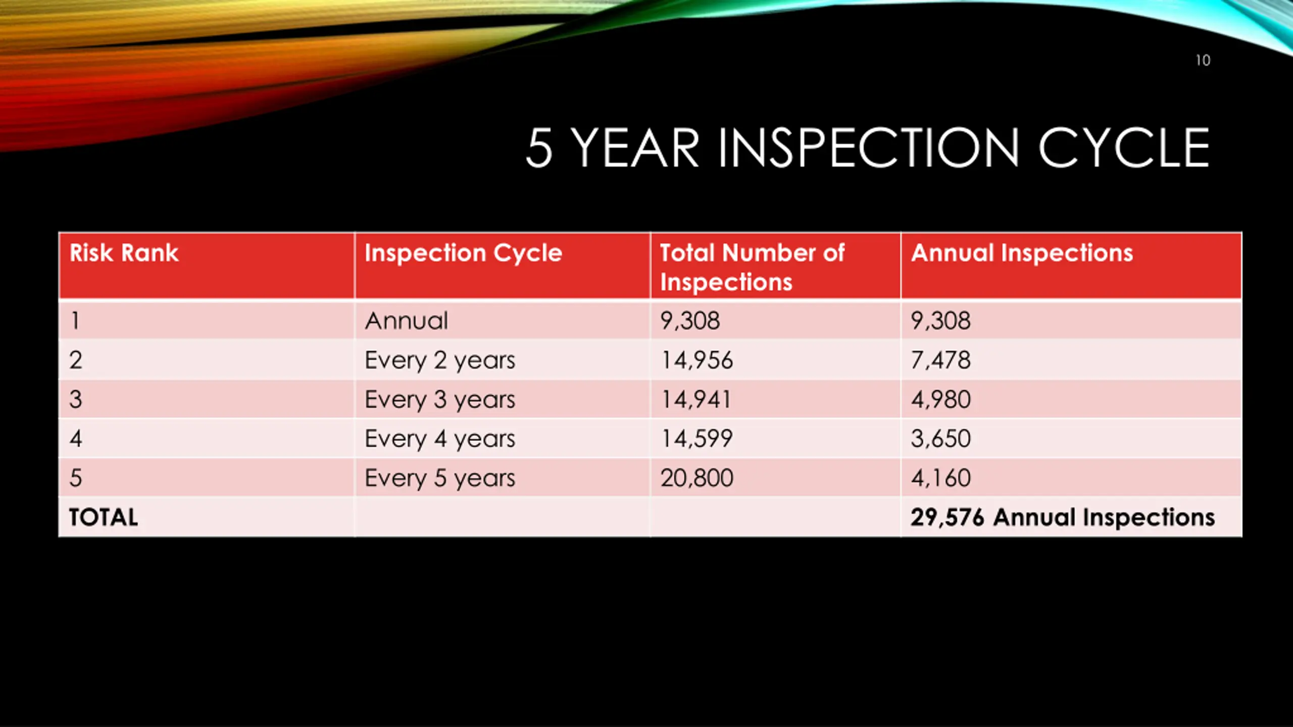 10 5 YEAR INSPECTION CYCLE Risk Rank Inspection Cycle Total Number of Inspections 9,308 14,956 14,941 14,599 20,800 Annual Inspections 1 2 3 4 5 TOTAL Annual Every 2 years Every 3 years Every 4 years Every 5 years 9,308 7,478 4,980 3,650 4,160 29,576 Annual Inspections