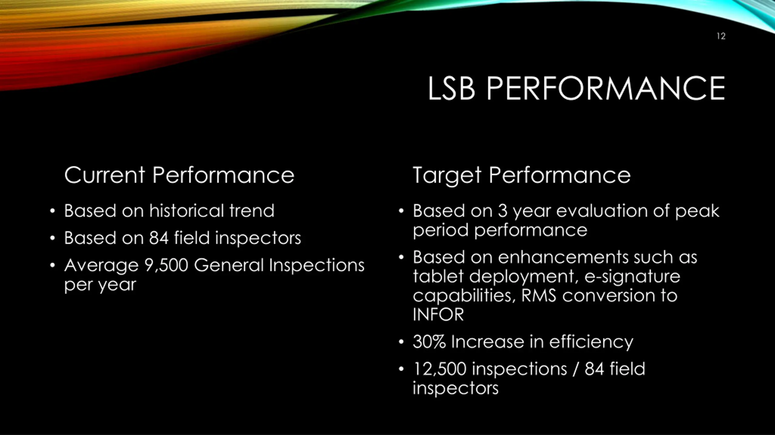 12 LSB PERFORMANCE Current Performance Target Performance Based on historical trend Based on 84 field inspectors Average 9,500 General Inspections per year Based on 3 year evaluation of peak period performance Based on enhancements such as tablet deployment, e-signature capabilities, RMS conversion to INFOR 30% Increase in efficiency 12,500 inspections / 84 field inspectors