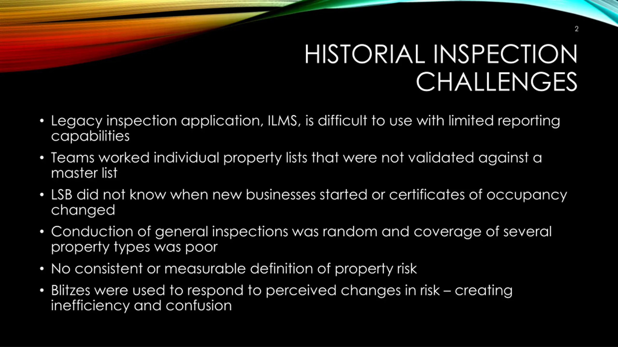 2 HISTORIAL INSPECTION CHALLENGES Legacy inspection application, ILMS, is difficult to use with limited reporting capabilities Teams worked individual property lists that were not validated against a master list LSB did not know when new businesses started or certificates of occupancy changed Conduction of general inspections was random and coverage of several property types was poor No consistent or measurable definition of property risk Blitzes were used to respond to perceived changes in risk creating inefficiency and confusion