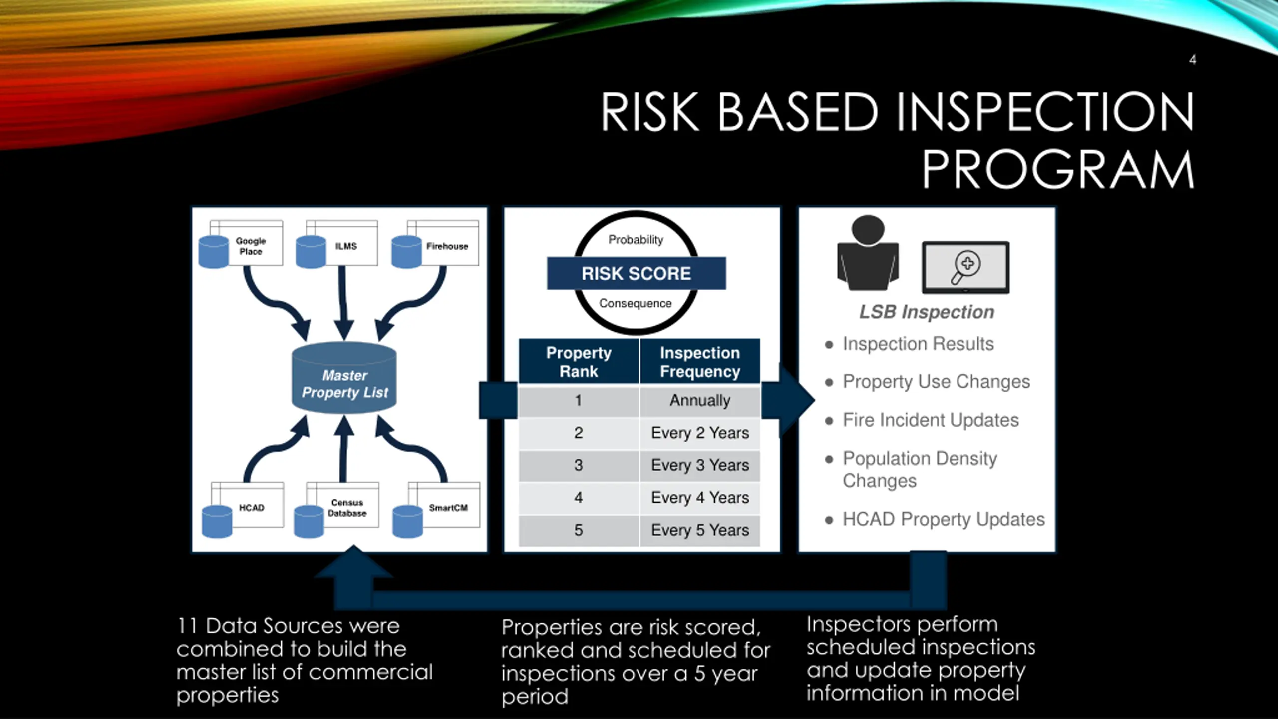 The Life Safety Bureau's Risk Based Inspection Program addresses historical challenges in property inspections, such as reliance on a difficult-to-use legacy system and inconsistent definitions of property risk. The program aims to implement a strategic plan for periodic inspections based on risk factors, ensuring updated property information and effective inspection frequency. Data sources have been consolidated to establish a master list of commercial properties, guiding risk assessment and improving overall safety management.