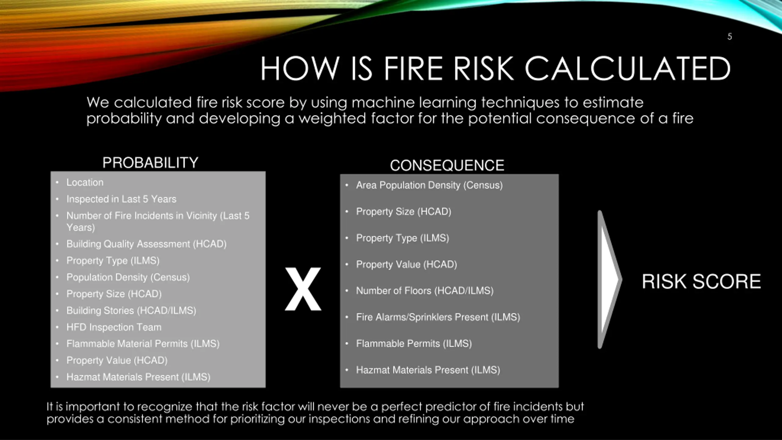 5 HOW IS FIRE RISK CALCULATED We calculated fire risk score by using machine learning techniques to estimate probability and developing a weighted factor for the potential consequence of a fire PROBABILITY CONSEQUENCE Location Area Population Density (Census) Inspected in Last 5 Years Property Size (HCAD) Number of Fire Incidents in Vicinity (Last 5 Years) Property Type (ILMS) Building Quality Assessment (HCAD) Property Type (ILMS) X Property Value (HCAD) RISK SCORE Population Density (Census) Number of Floors (HCAD/ILMS) Property Size (HCAD) Building Stories (HCAD/ILMS) Fire Alarms/Sprinklers Present (ILMS) HFD Inspection Team Flammable Permits (ILMS) Flammable Material Permits (ILMS) Property Value (HCAD) Hazmat Materials Present (ILMS) Hazmat Materials Present (ILMS) It is important to recognize that the risk factor will never be a perfect predictor of fire incidents but provides a consistent method for prioritizing our inspections and refining our approach over time