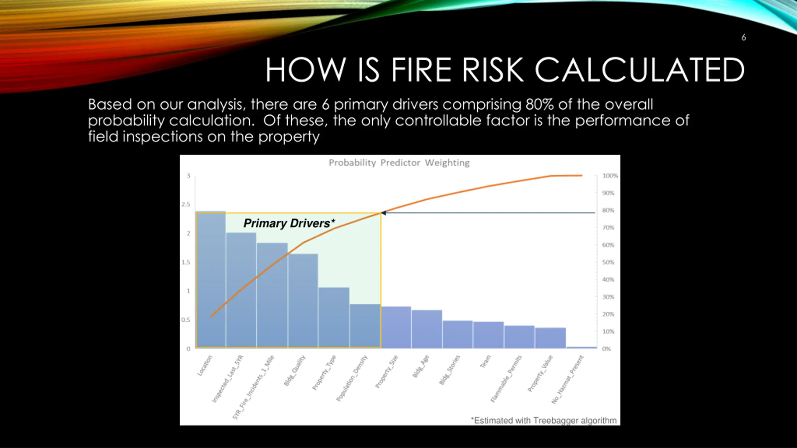 6 HOW IS FIRE RISK CALCULATED Based on our analysis, there are 6 primary drivers comprising 80% of the overall probability calculation. Of these, the only controllable factor is the performance of field inspections on the property Primary Drivers* *Estimated with Treebagger algorithm