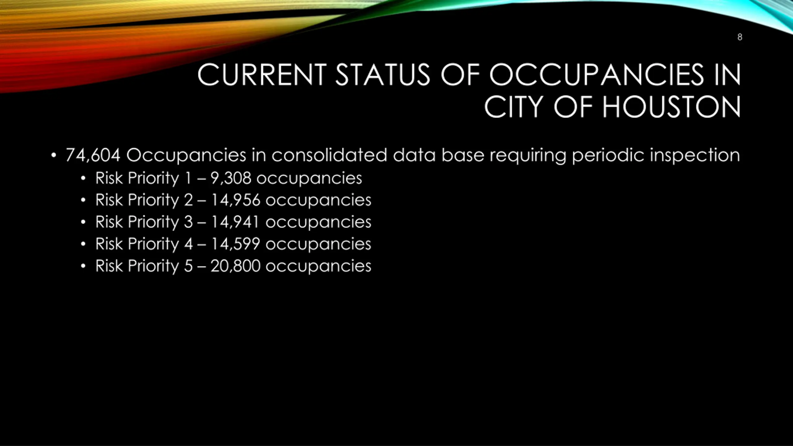 8 CURRENT STATUS OF OCCUPANCIES IN CITY OF HOUSTON 74,604 Occupancies in consolidated data base requiring periodic inspection Risk Priority 1 9,308 occupancies Risk Priority 2 14,956 occupancies Risk Priority 3 14,941 occupancies Risk Priority 4 14,599 occupancies Risk Priority 5 20,800 occupancies