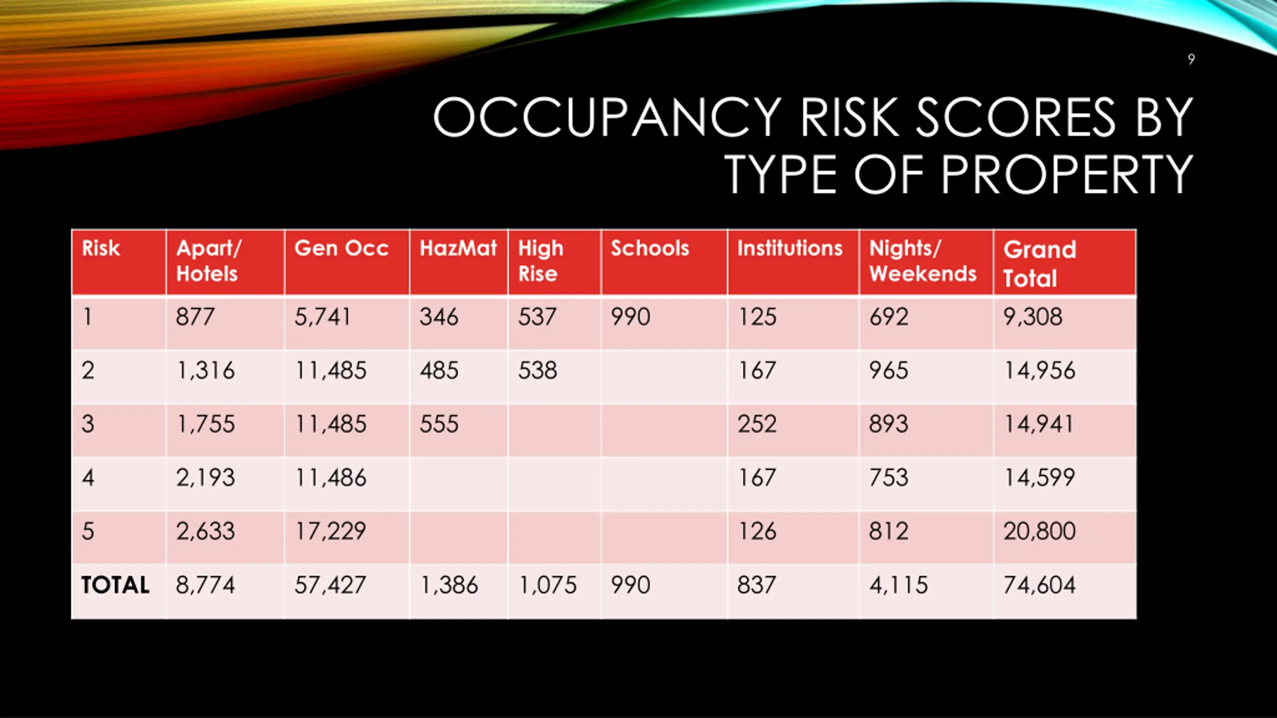 9 OCCUPANCY RISK SCORES BY TYPE OF PROPERTY Grand Total 9,308 Risk Apart/ Hotels Gen Occ HazMat High Rise Schools Institutions Nights/ Weekends 1 877 5,741 346 537 990 125 692 2 1,316 11,485 485 538 167 965 14,956 3 1,755 11,485 555 252 893 14,941 4 2,193 11,486 167 753 14,599 5 2,633 17,229 126 812 20,800 TOTAL 8,774 57,427 1,386 1,075 990 837 4,115 74,604