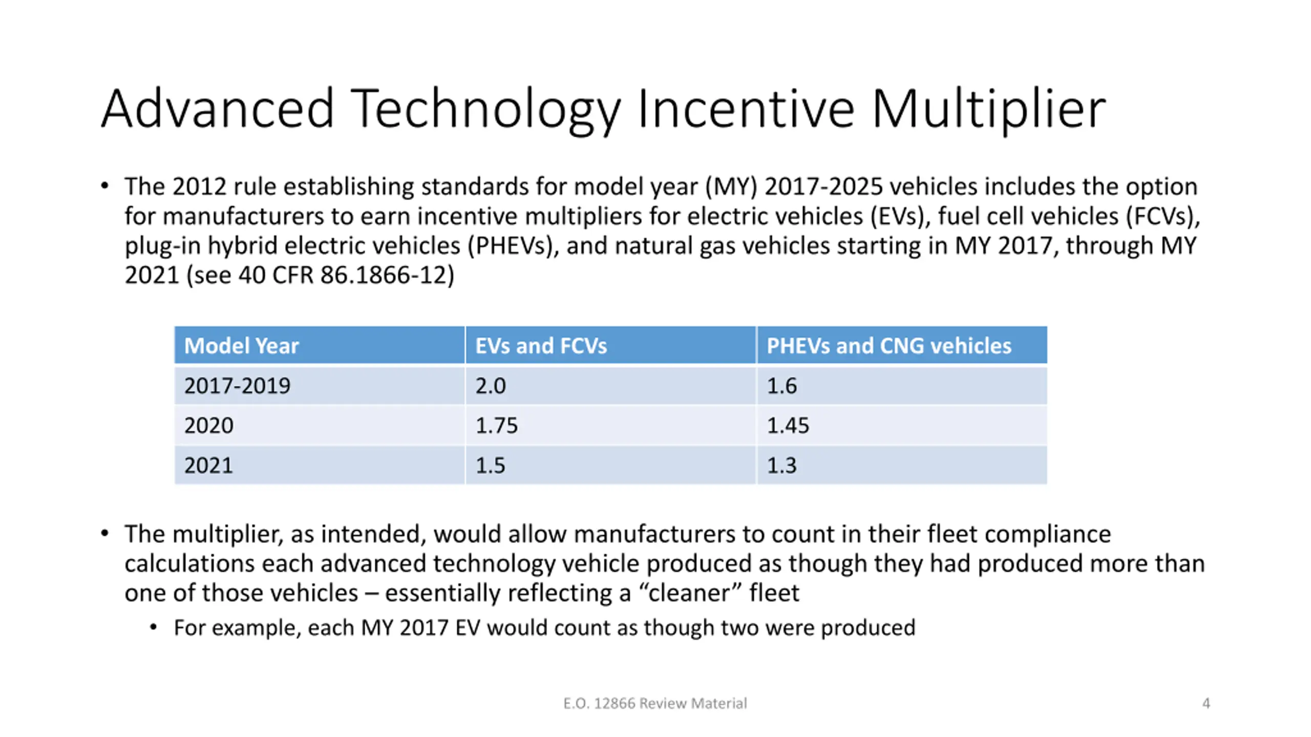 Advanced Technology Incentive Multiplier The 2012 rule establishing standards for model year (MY) 2017-2025 vehicles includes the option for manufacturers to earn incentive multipliers for electric vehicles (EVs), fuel cell vehicles (FCVs), plug-in hybrid electric vehicles (PHEVs), and natural gas vehicles starting in MY 2017, through MY 2021 (see 40 CFR 86.1866-12) Model Year EVs and FCVs PHEVs and CNG vehicles 2017-2019 2.0 1.6 2020 1.75 1.45 2021 1.5 1.3 The multiplier, as intended, would allow manufacturers to count in their fleet compliance calculations each advanced technology vehicle produced as though they had produced more than one of those vehicles essentially reflecting a cleaner fleet For example, each MY 2017 EV would count as though two were produced E.O. 12866 Review Material 4