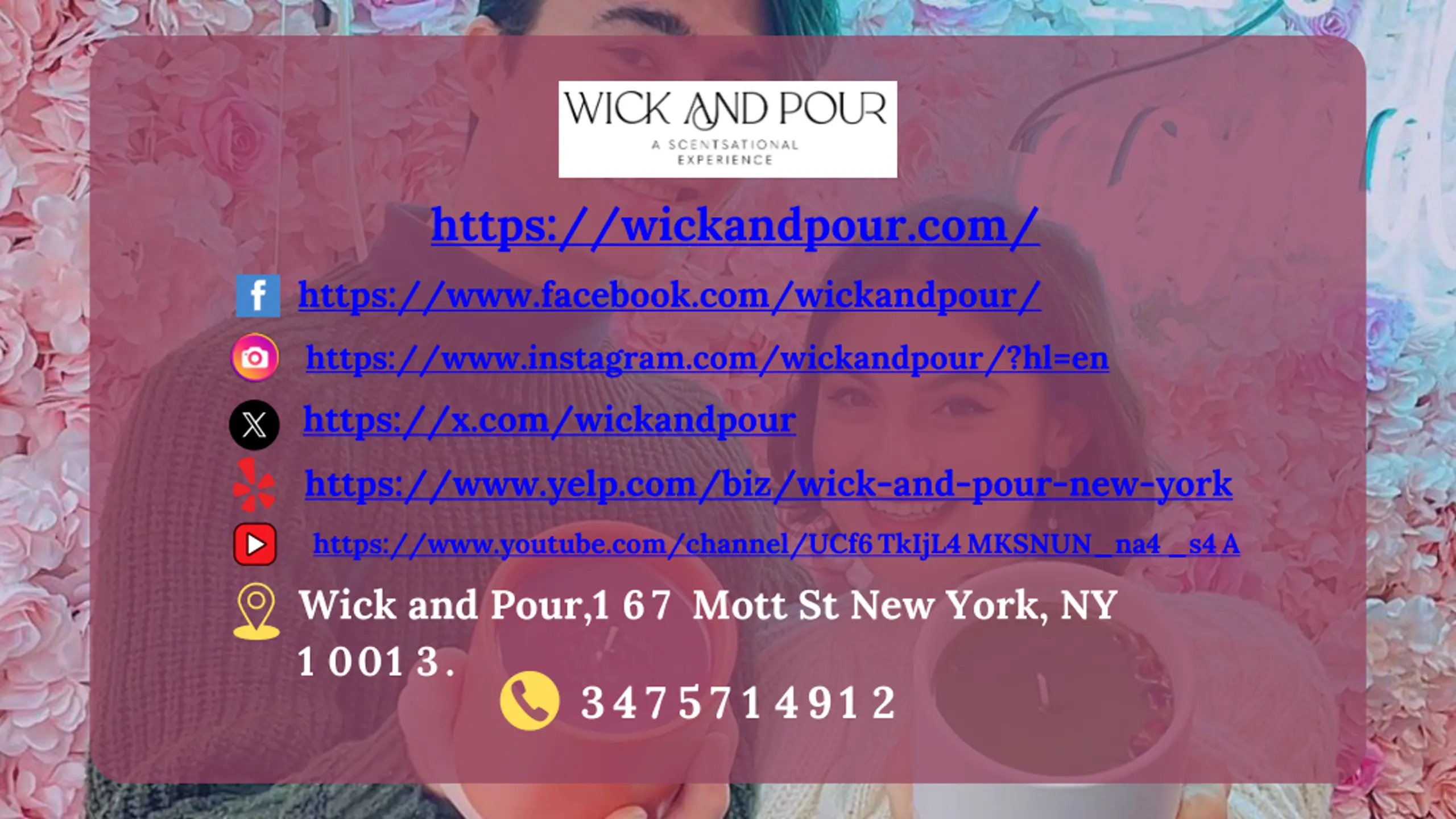 https://wickandpour.com/ https://www.facebook.com/wickandpour/ https://www.instagram.com/wickandpour/?hl=en https://x.com/wickandpour https://www.yelp.com/biz/wick-and-pour-new-york https://www.youtube.com/channel/UCf6TkIjL4MKSNUN_na4_s4A Wick and Pour,1 67 Mott St New York, NY 1 001 3. 347 57 1 491 2