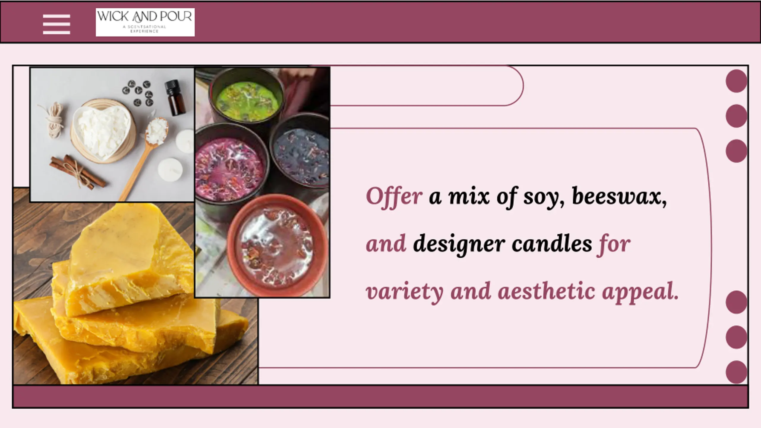 Offer a mix of soy, beeswax, and designer candles for variety and aesthetic appeal.
