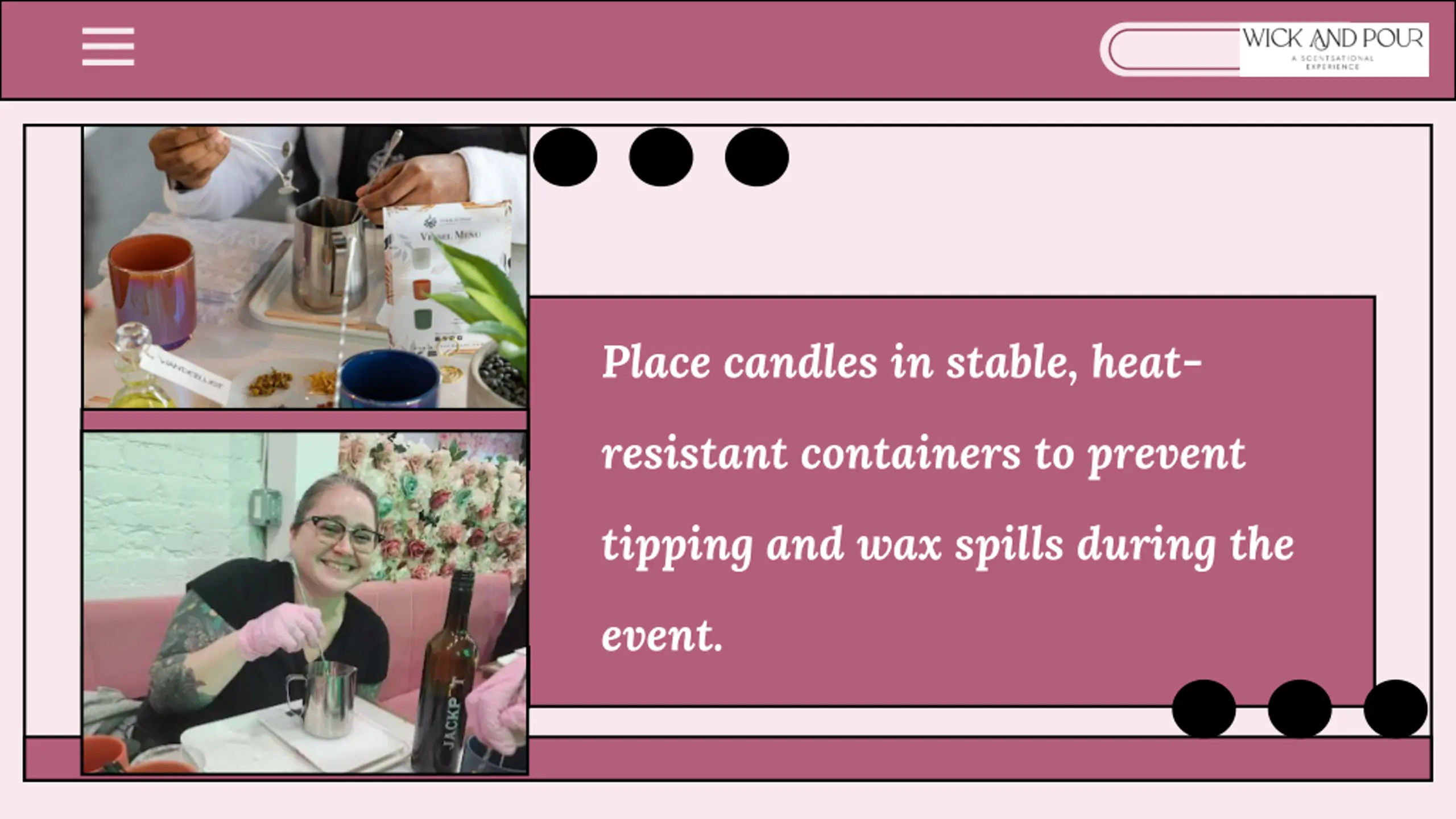 Place candles in stable, heat- resistant containers to prevent tipping and wax spills during the event.