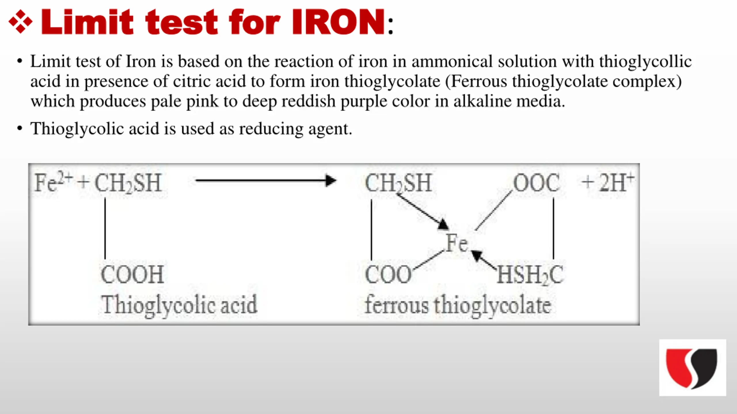 Limit test for IRON Limit test for IRON: : Limit test of Iron is based on the reaction of iron in ammonical solution with thioglycollic acid in presence of citric acid to form iron thioglycolate (Ferrous thioglycolate complex) which produces pale pink to deep reddish purple color in alkaline media. Thioglycolic acid is used as reducing agent.