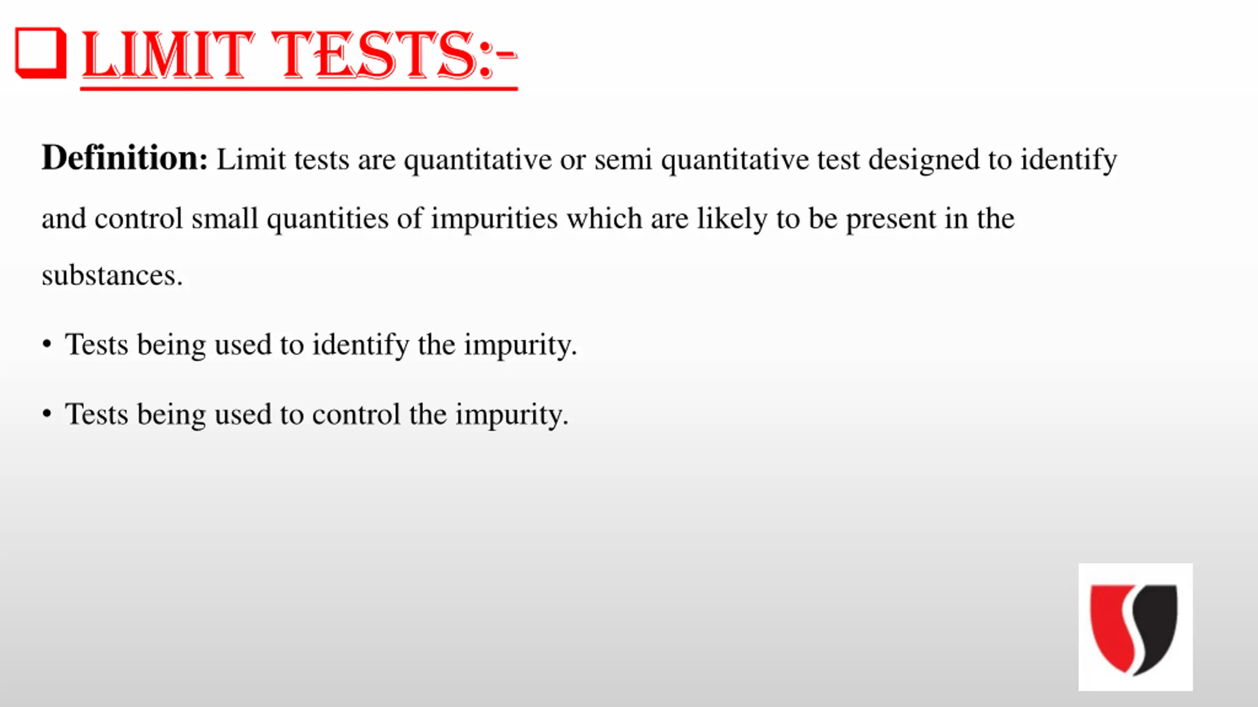 Limit tests:- Definition: Limit tests are quantitative or semi quantitative test designed to identify and control small quantities of impurities which are likely to be present in the substances. Tests being used to identify the impurity. Tests being used to control the impurity.
