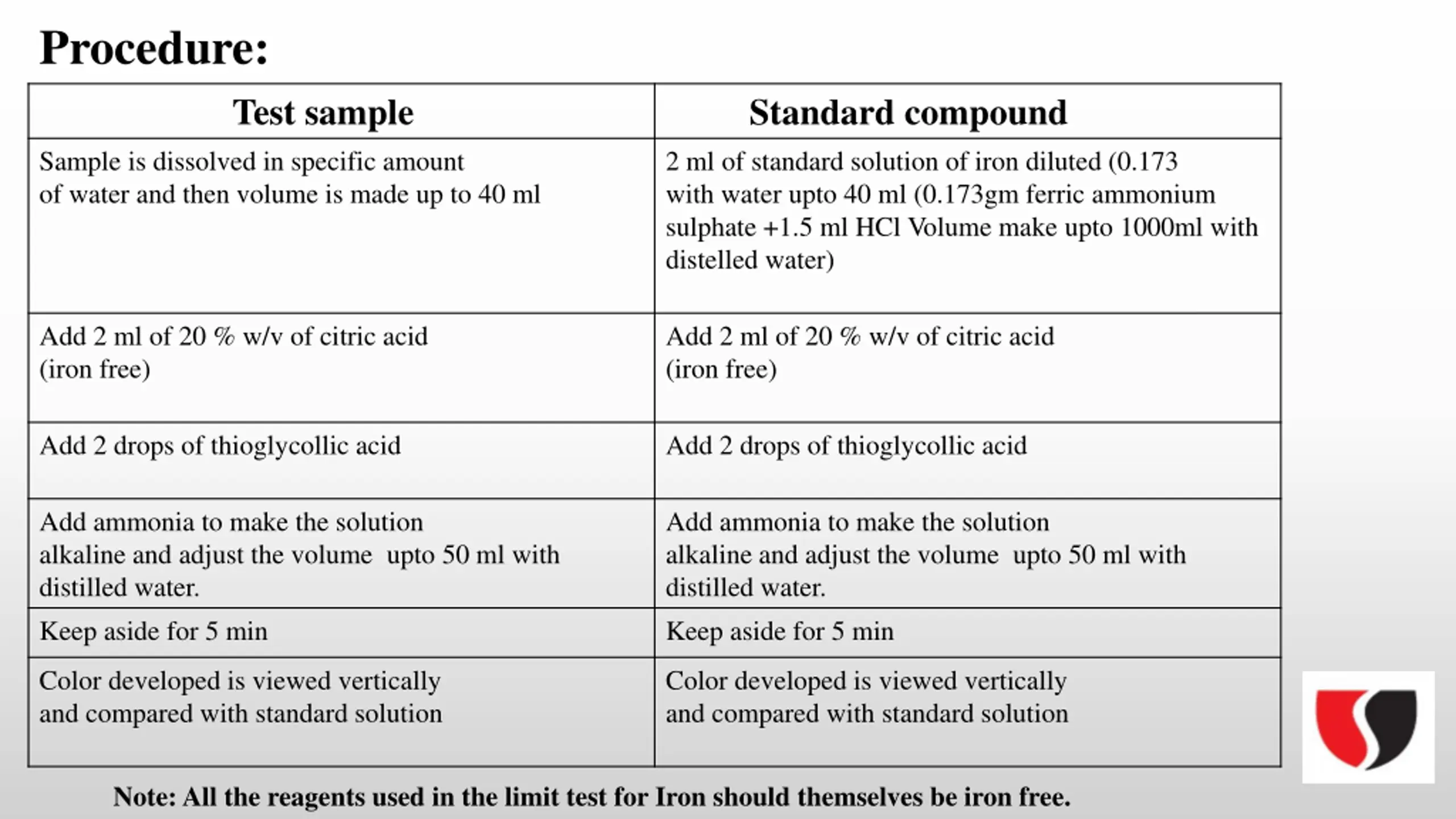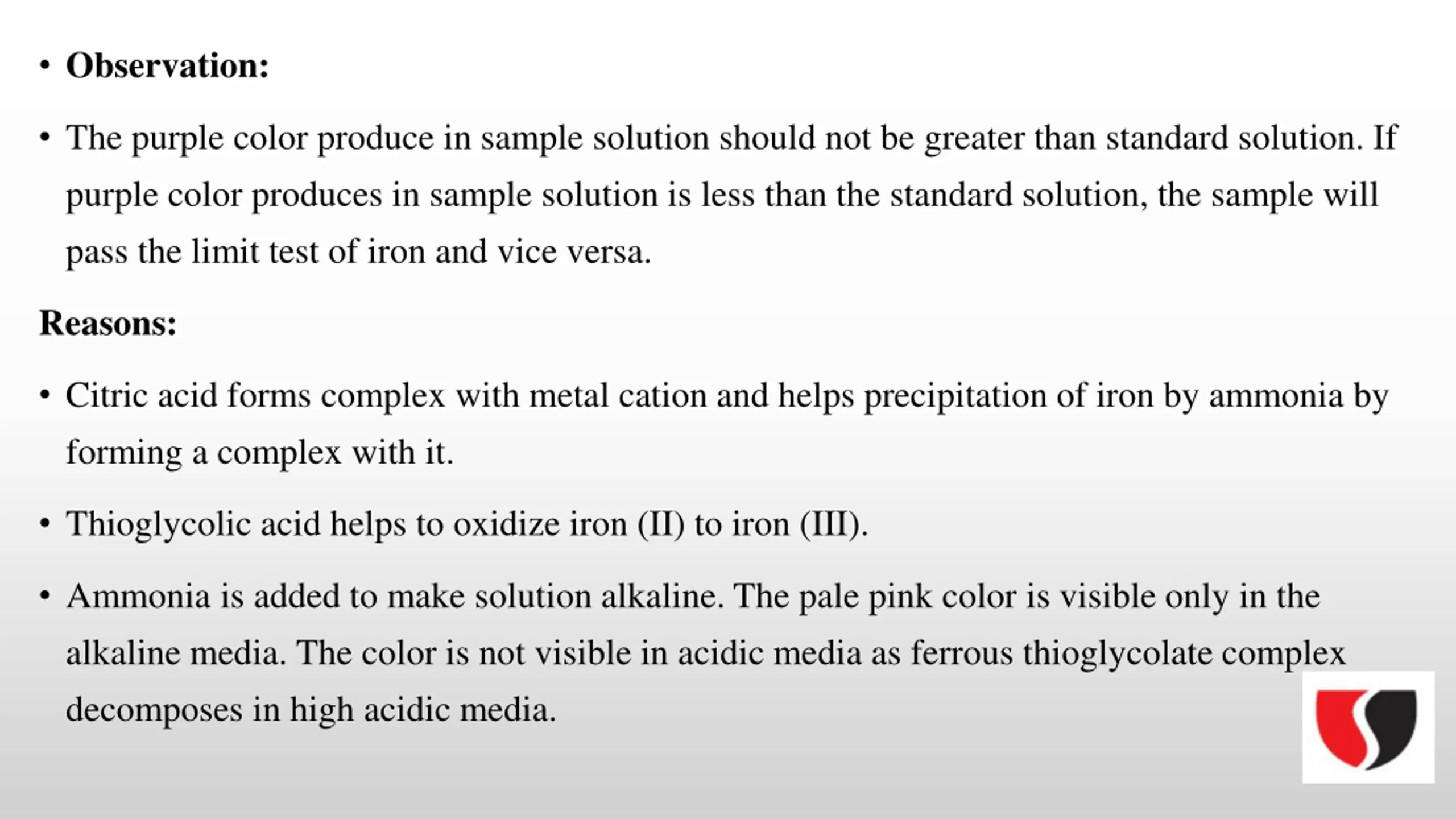 Observation: The purple color produce in sample solution should not be greater than standard solution. If purple color produces in sample solution is less than the standard solution, the sample will pass the limit test of iron and vice versa. Reasons: Citric acid forms complex with metal cation and helps precipitation of iron by ammonia by forming a complex with it. Thioglycolic acid helps to oxidize iron (II) to iron (III). Ammonia is added to make solution alkaline. The pale pink color is visible only in the alkaline media. The color is not visible in acidic media as ferrous thioglycolate complex decomposes in high acidic media.