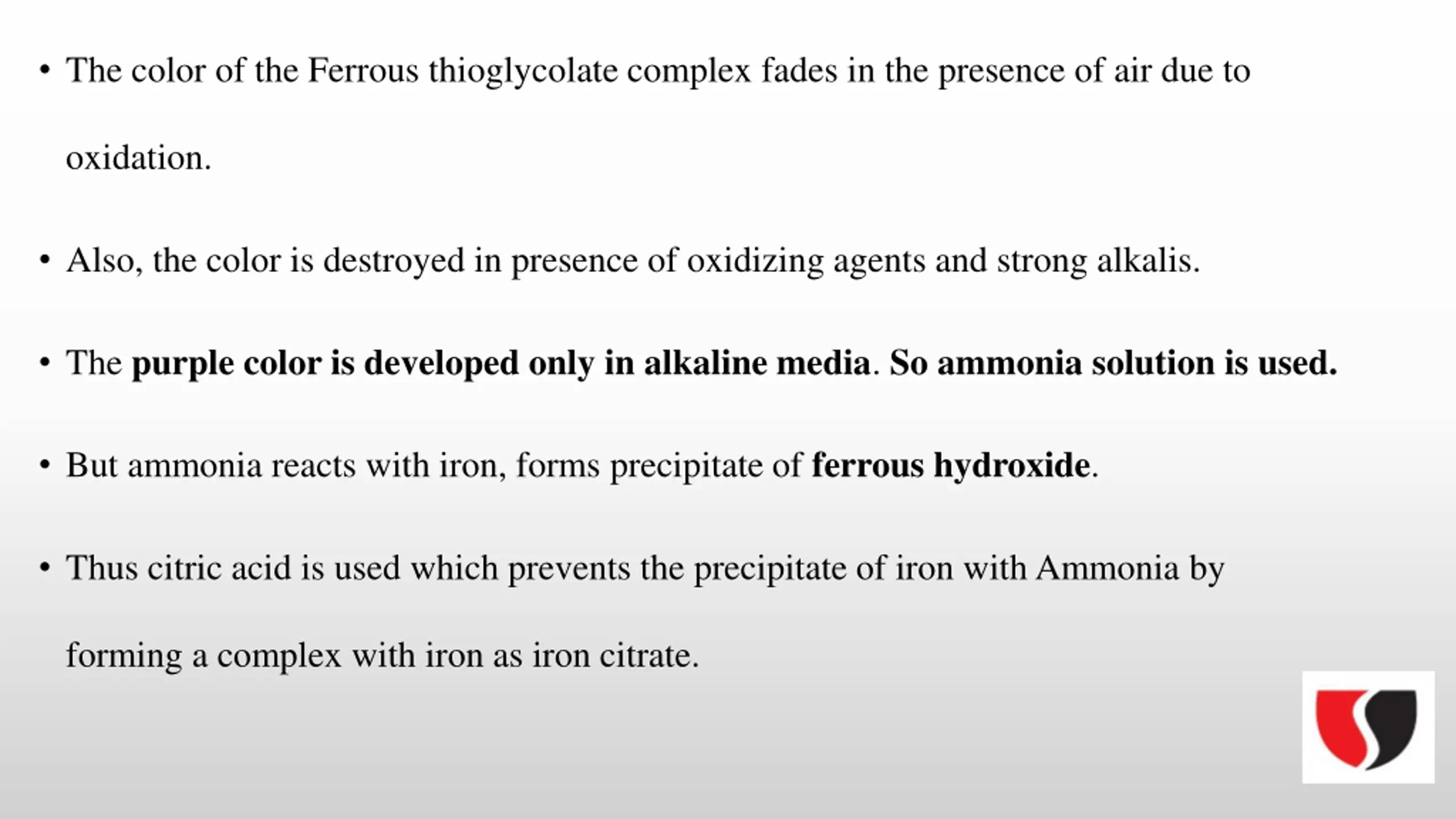 The color of the Ferrous thioglycolate complex fades in the presence of air due to oxidation. Also, the color is destroyed in presence of oxidizing agents and strong alkalis. The purple color is developed only in alkaline media. So ammonia solution is used. But ammonia reacts with iron, forms precipitate of ferrous hydroxide. Thus citric acid is used which prevents the precipitate of iron with Ammonia by forming a complex with iron as iron citrate.