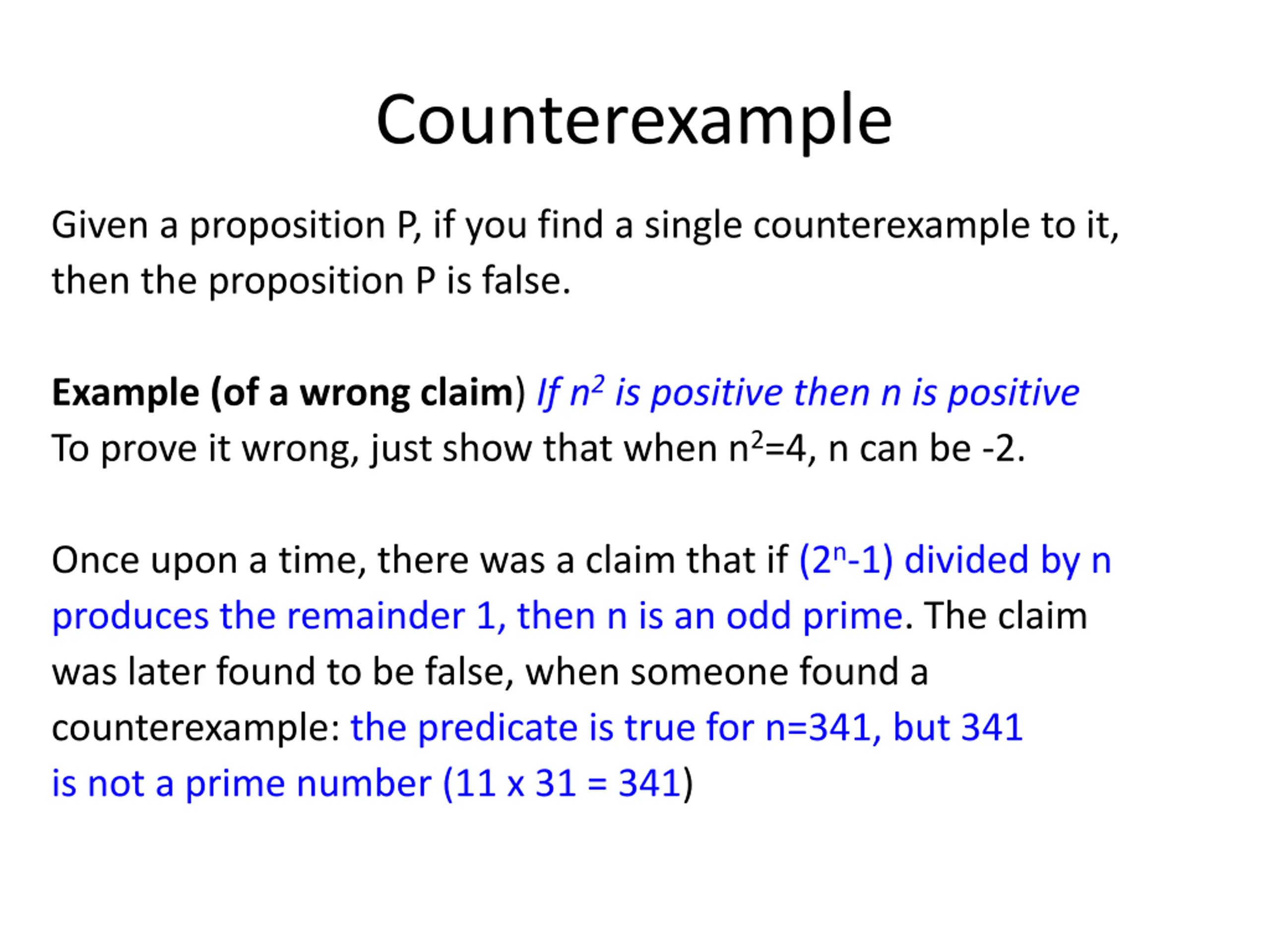 Counterexample Given a proposition P, if you find a single counterexample to it, then the proposition P is false. Example (of a wrong claim) If n2 is positive then n is positive To prove it wrong, just show that when n2=4, n can be -2. Once upon a time, there was a claim that if (2n-1) divided by n produces the remainder 1, then n is an odd prime. The claim was later found to be false, when someone found a counterexample: the predicate is true for n=341, but 341 is not a prime number (11 x 31 = 341)