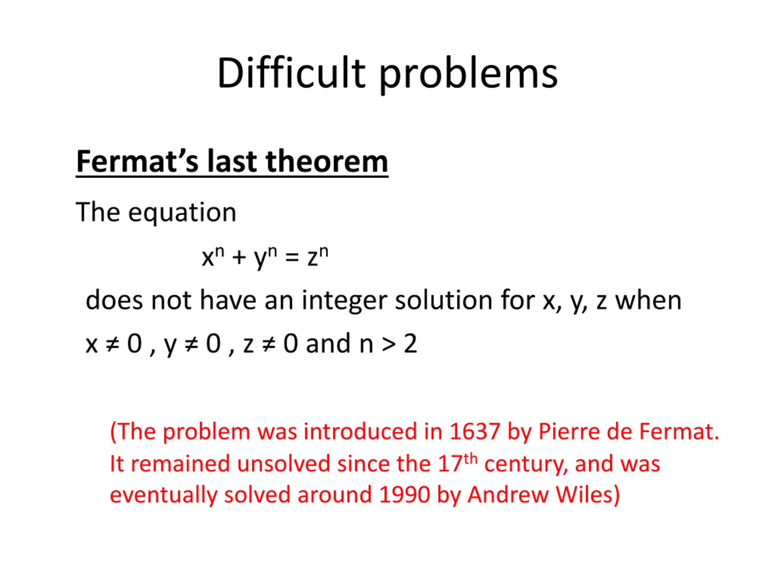Difficult problems Fermat s last theorem The equation xn + yn = zn does not have an integer solution for x, y, z when x 0 , y 0 , z 0 and n > 2 (The problem was introduced in 1637 by Pierre de Fermat. It remained unsolved since the 17th century, and was eventually solved around 1990 by Andrew Wiles)