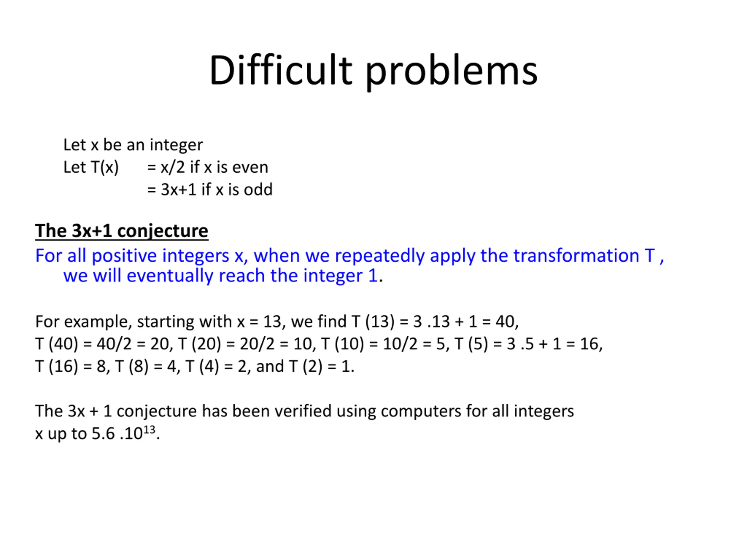 Difficult problems Let x be an integer Let T(x) = x/2 if x is even = 3x+1 if x is odd The 3x+1 conjecture For all positive integers x, when we repeatedly apply the transformation T , we will eventually reach the integer 1. For example, starting with x = 13, we find T (13) = 3 .13 + 1 = 40, T (40) = 40/2 = 20, T (20) = 20/2 = 10, T (10) = 10/2 = 5, T (5) = 3 .5 + 1 = 16, T (16) = 8, T (8) = 4, T (4) = 2, and T (2) = 1. The 3x + 1 conjecture has been verified using computers for all integers x up to 5.6 .1013.