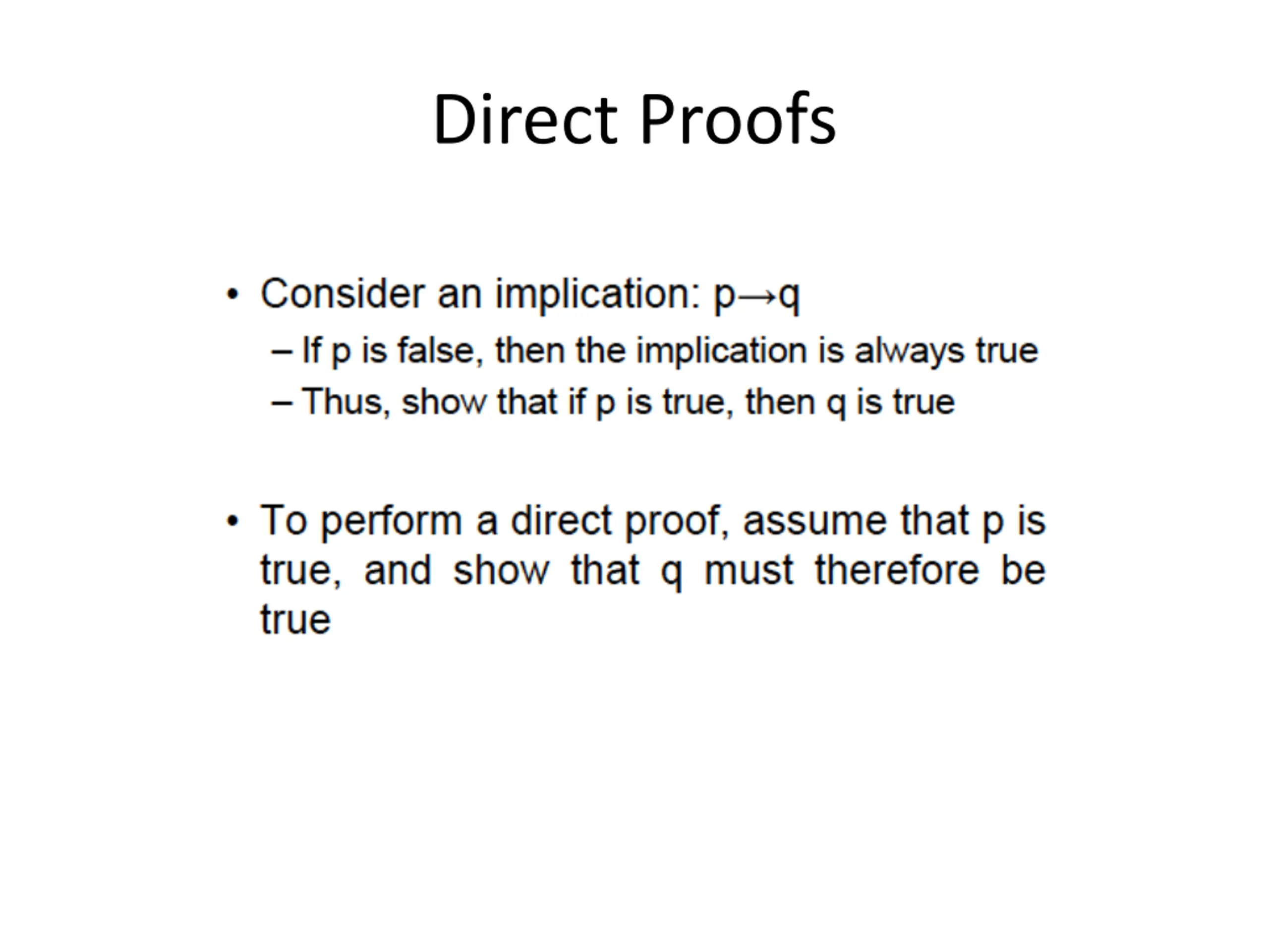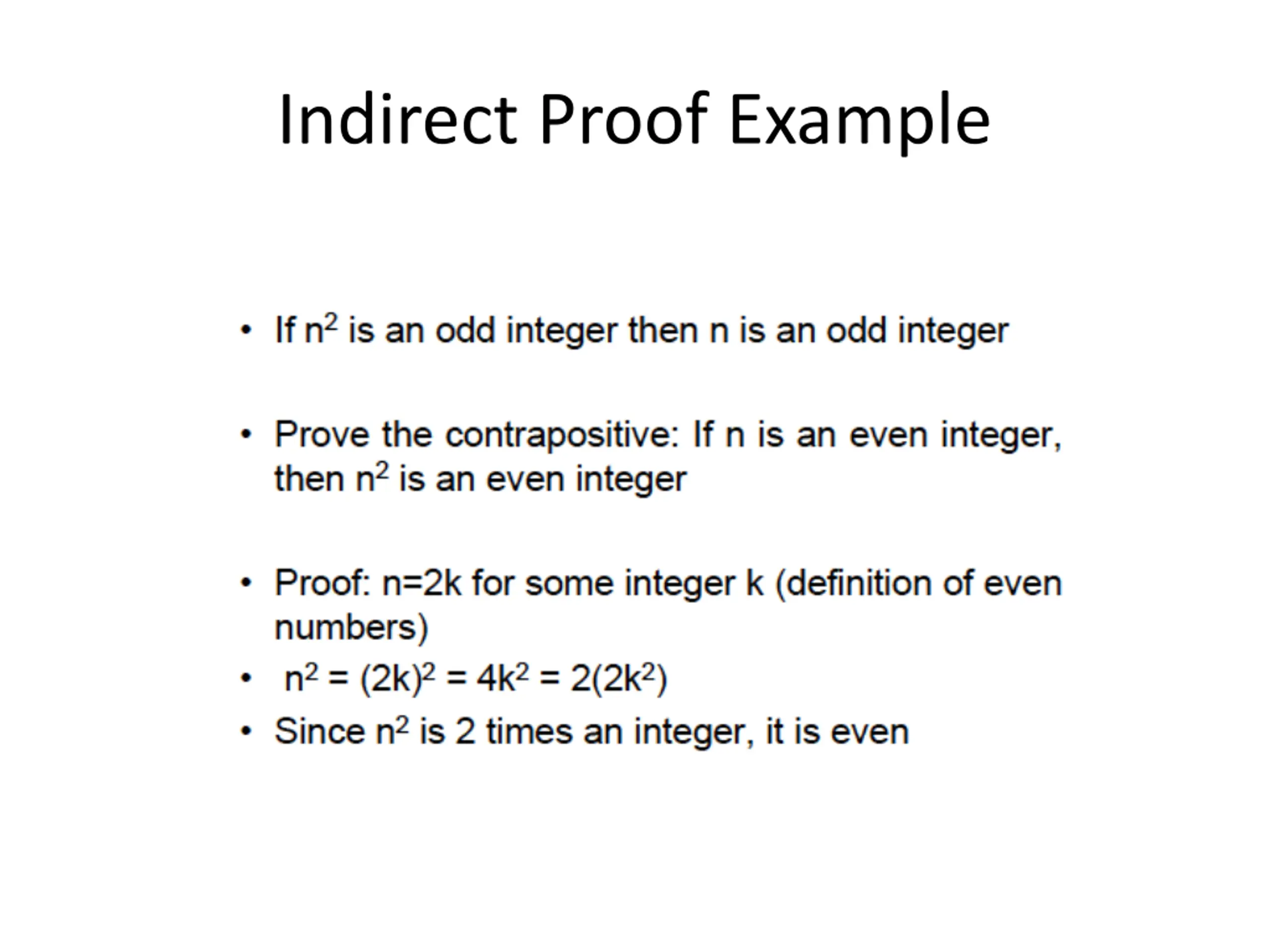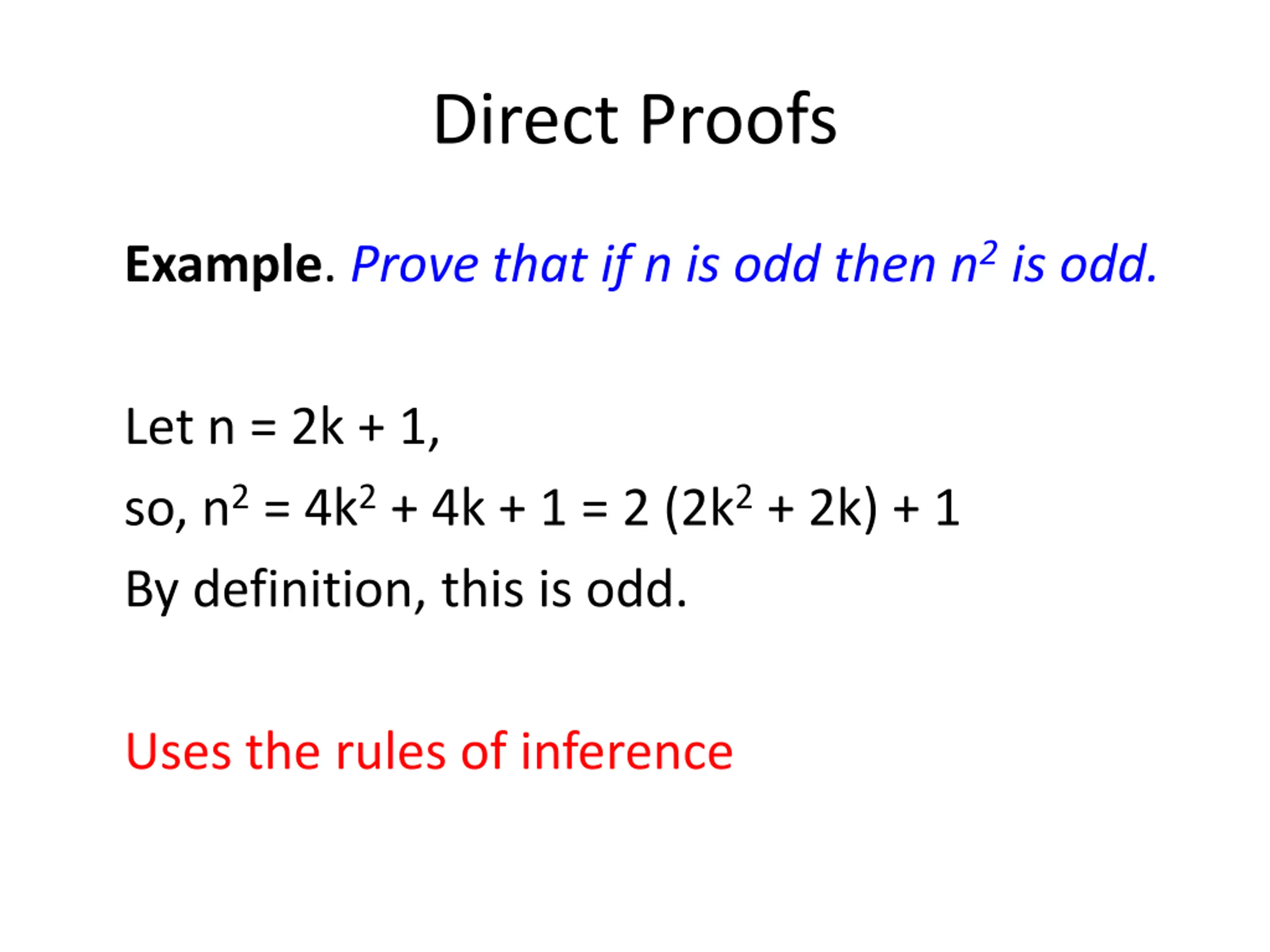 Direct Proofs Example. Prove that if n is odd then n2 is odd. Let n = 2k + 1, so, n2 = 4k2 + 4k + 1 = 2 (2k2 + 2k) + 1 By definition, this is odd. Uses the rules of inference