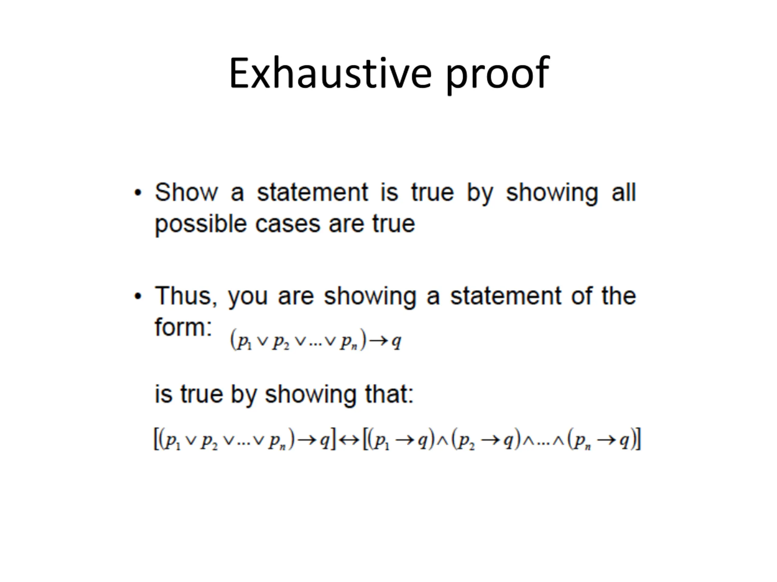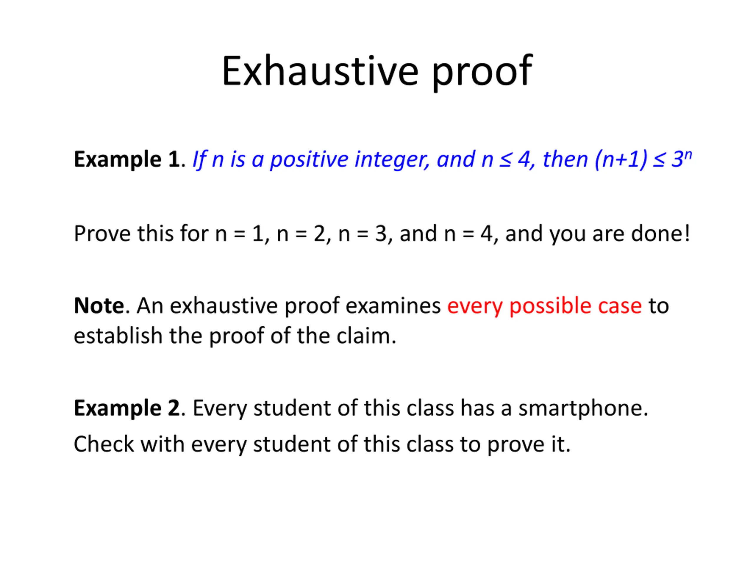 Exhaustive proof Example 1. If n is a positive integer, and n 4, then (n+1) 3n Prove this for n = 1, n = 2, n = 3, and n = 4, and you are done! Note. An exhaustive proof examines every possible case to establish the proof of the claim. Example 2. Every student of this class has a smartphone. Check with every student of this class to prove it.