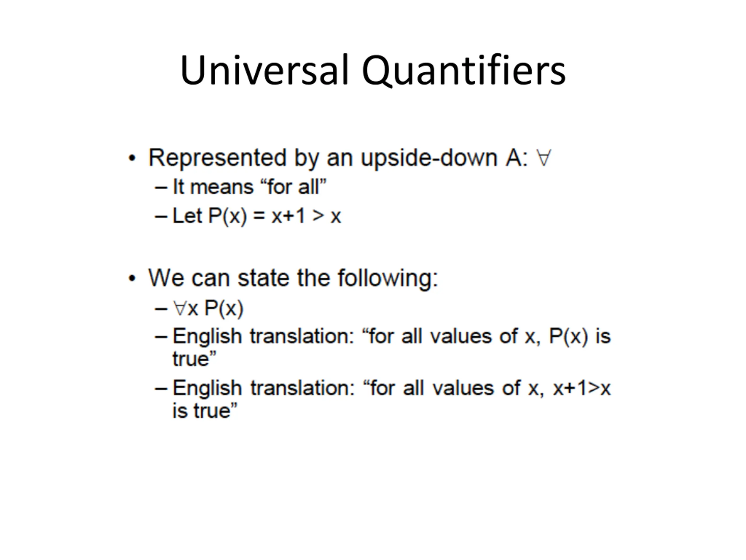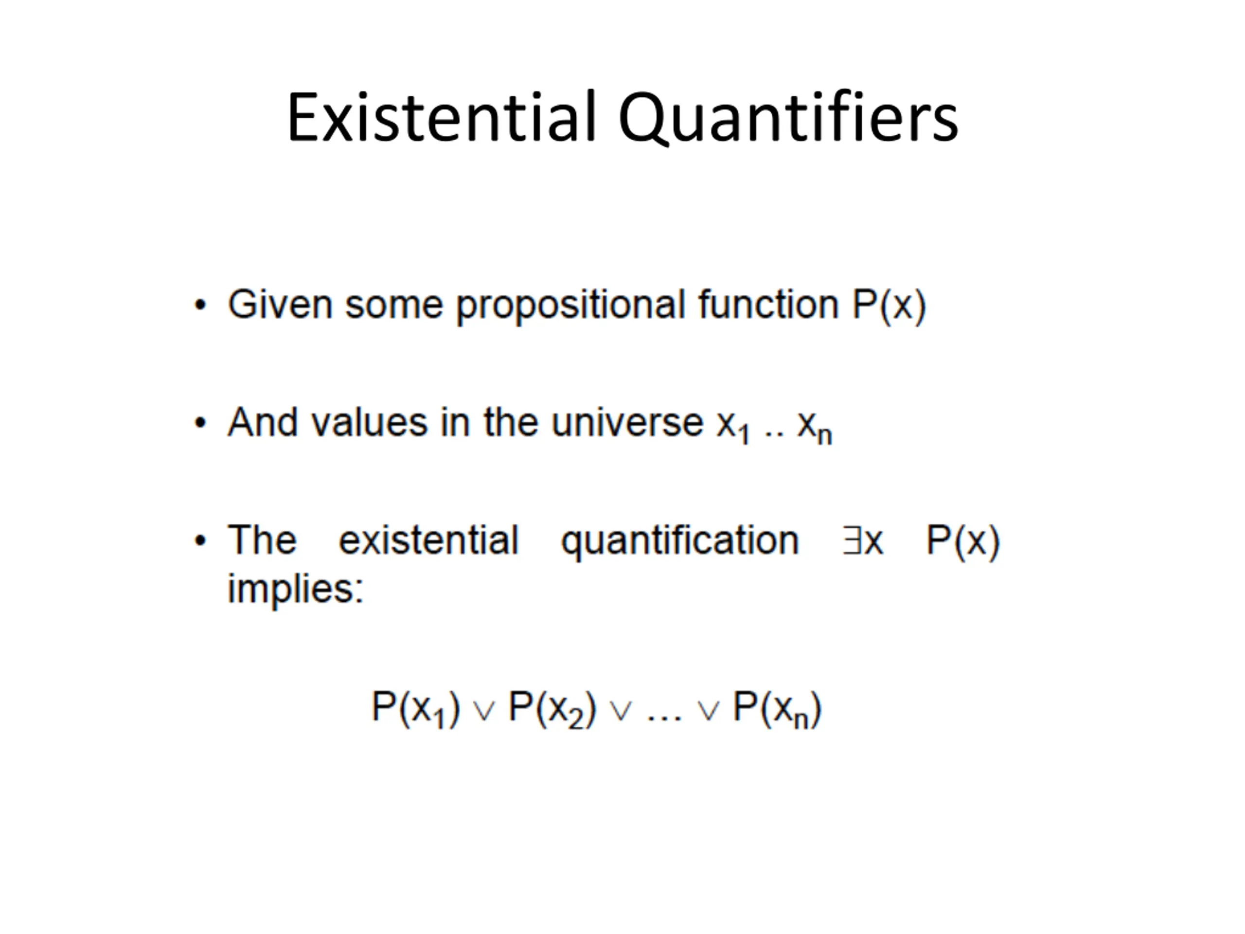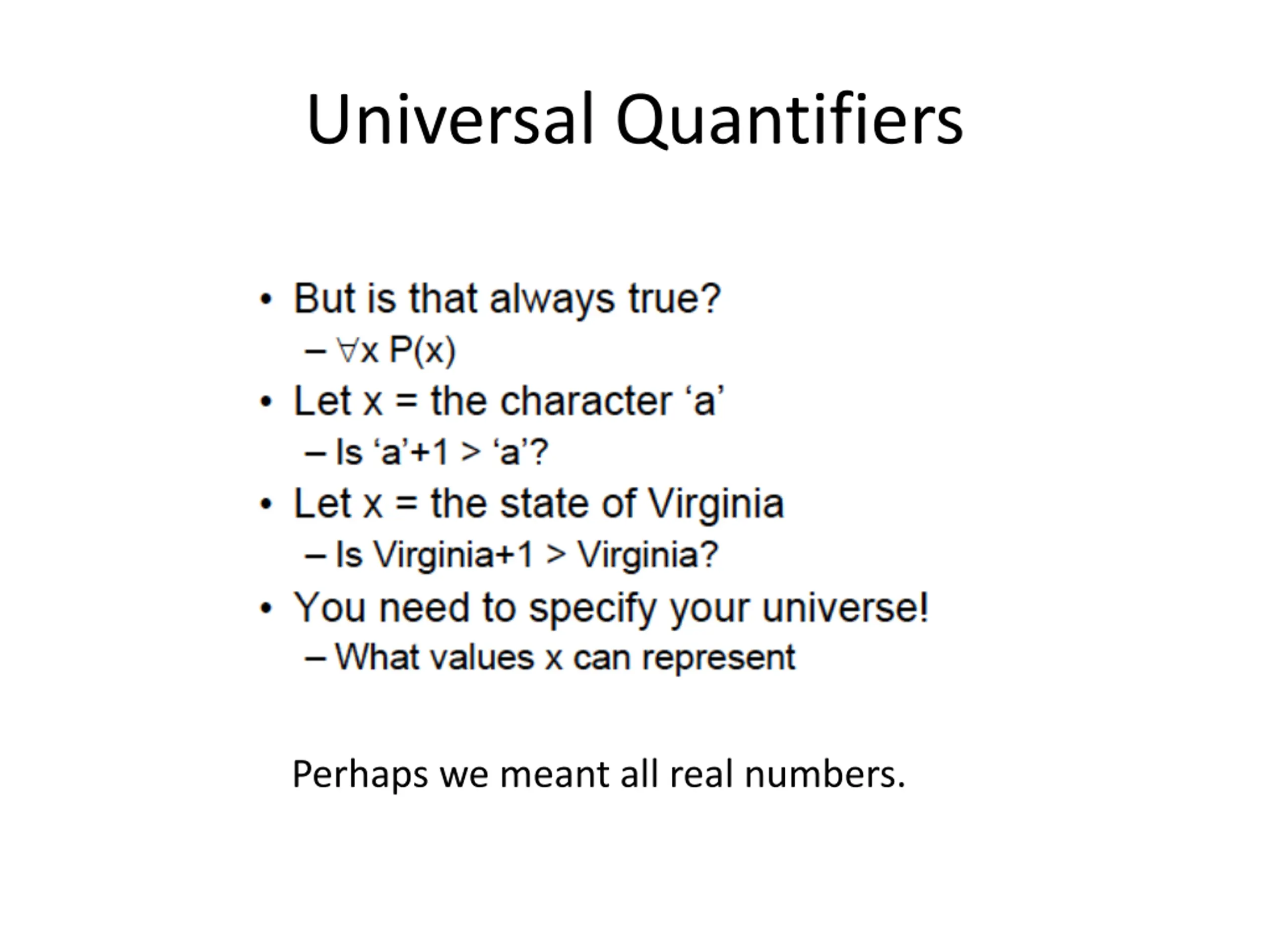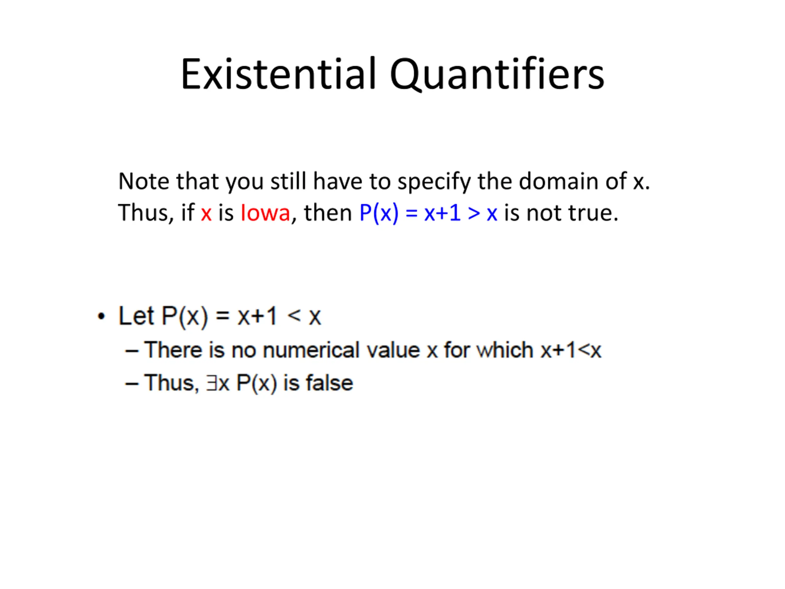 Existential Quantifiers Note that you still have to specify the domain of x. Thus, if x is Iowa, then P(x) = x+1 > x is not true.
