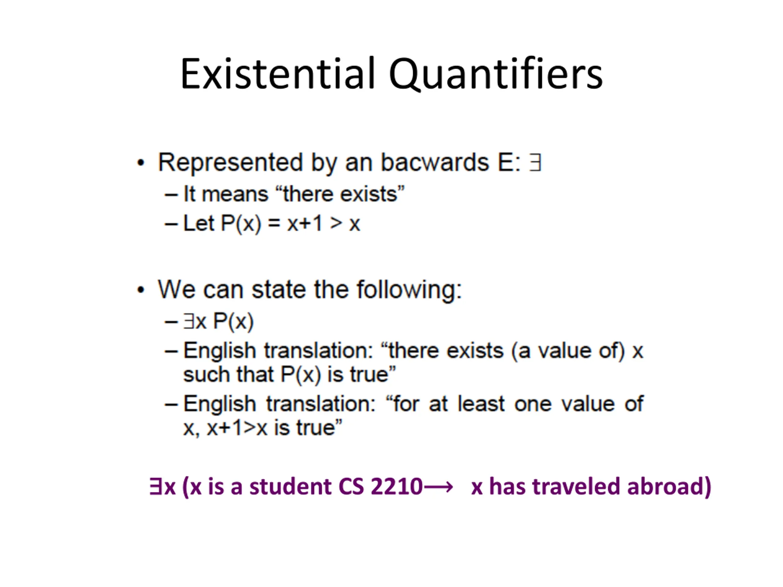 Existential Quantifiers x (x is a student CS 2210 x has traveled abroad)