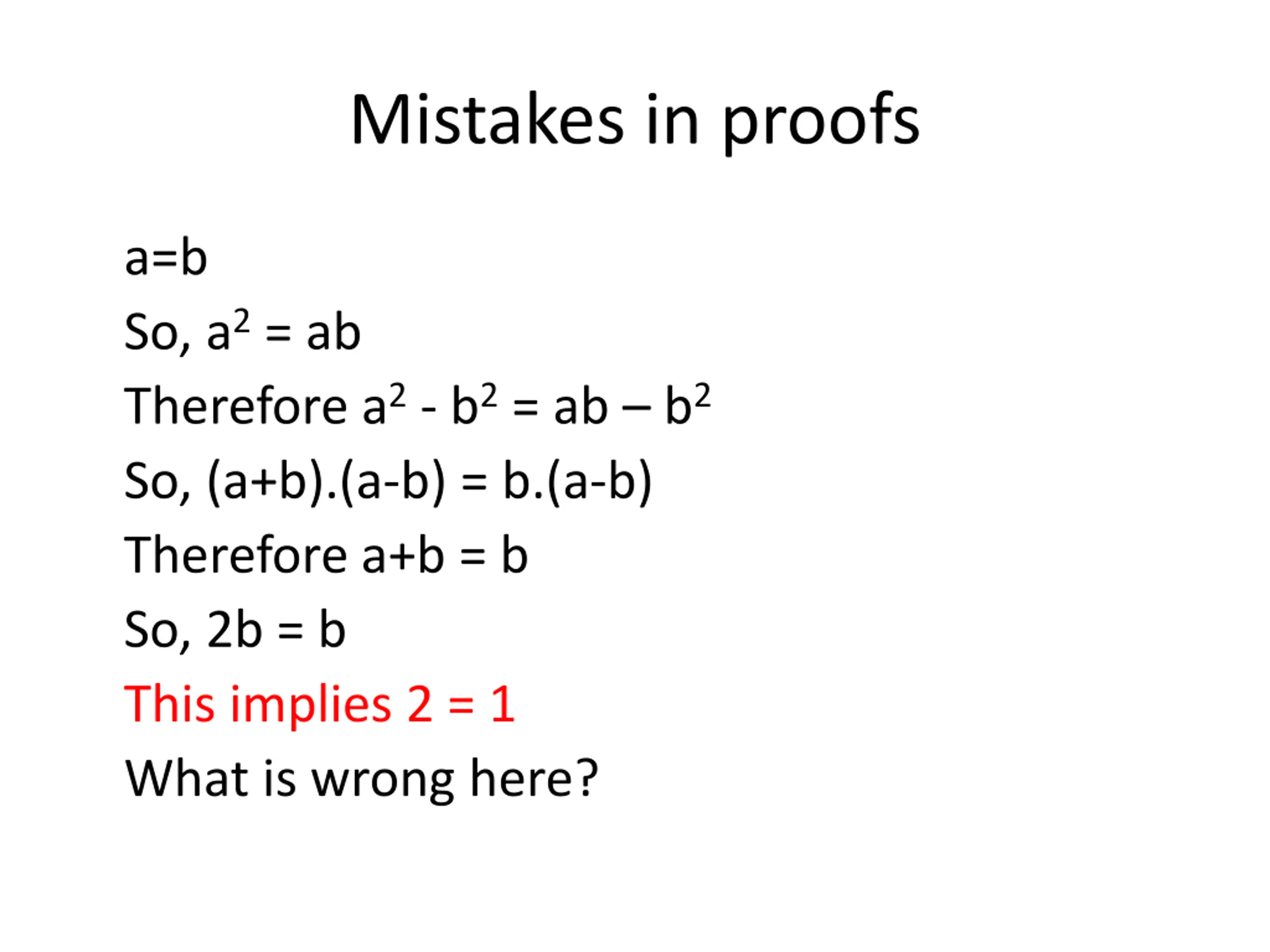 Mistakes in proofs a=b So, a2 = ab Therefore a2 - b2 = ab b2 So, (a+b).(a-b) = b.(a-b) Therefore a+b = b So, 2b = b This implies 2 = 1 What is wrong here?