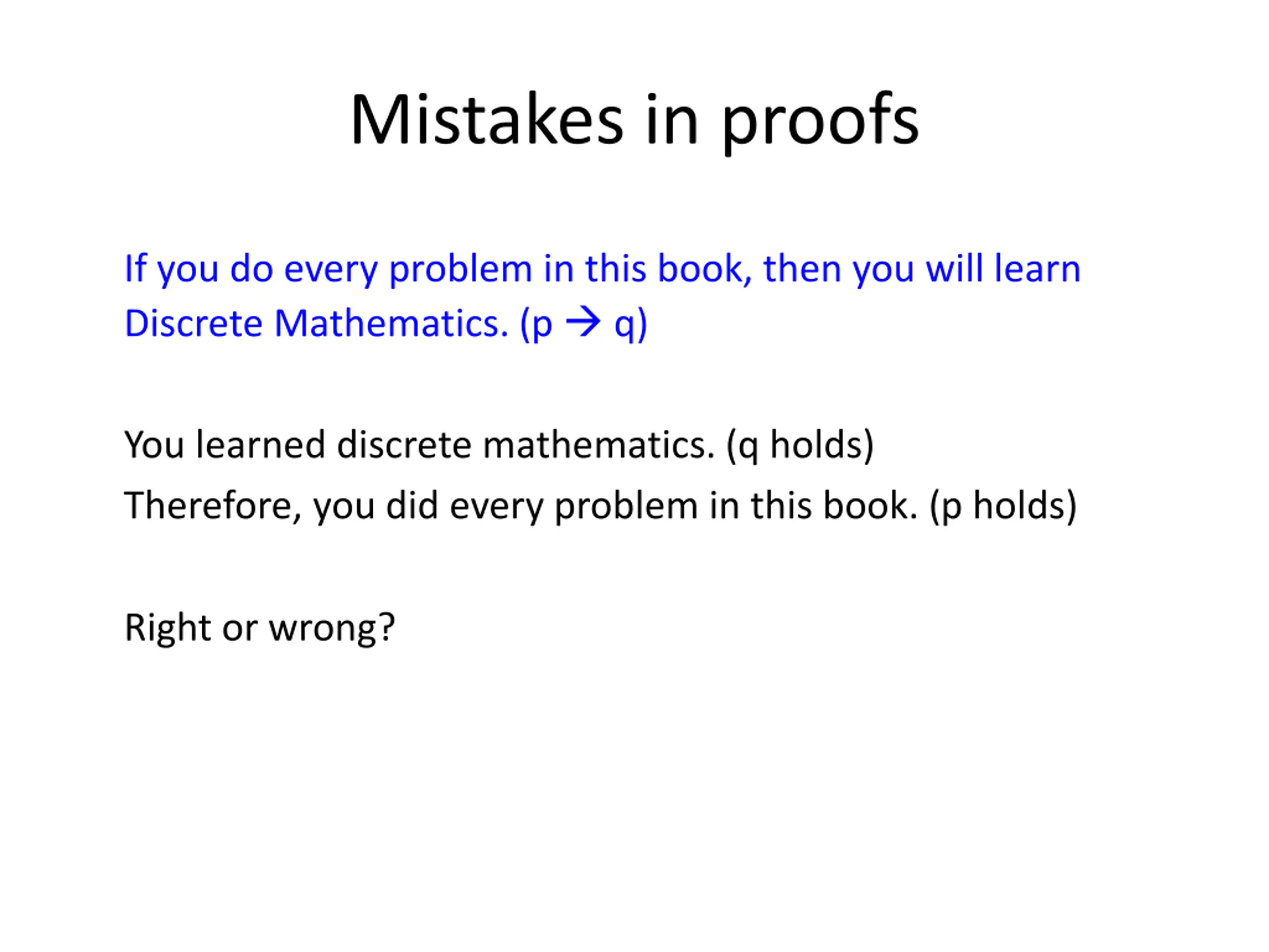 Mistakes in proofs If you do every problem in this book, then you will learn Discrete Mathematics. (p q) You learned discrete mathematics. (q holds) Therefore, you did every problem in this book. (p holds) Right or wrong?