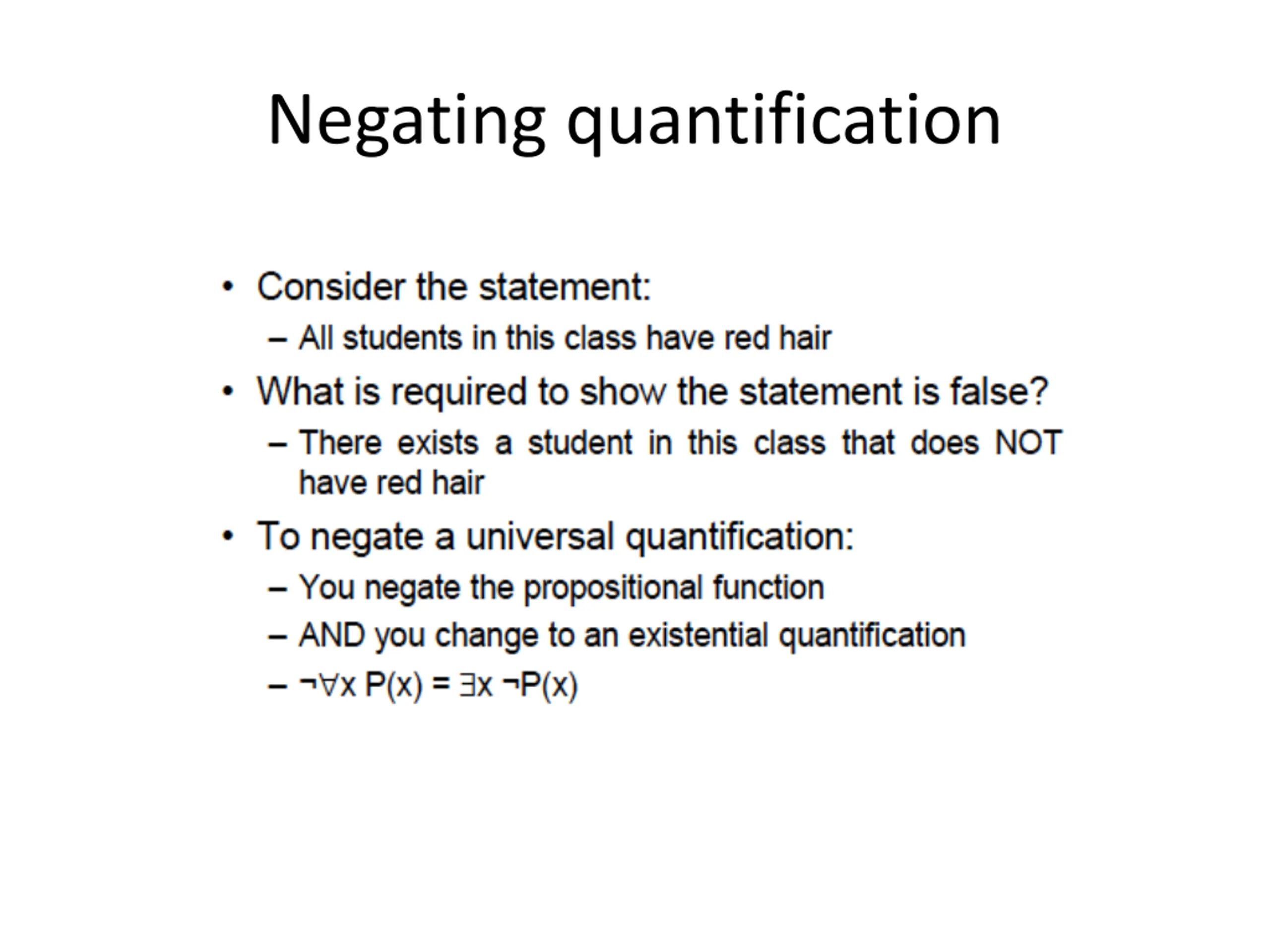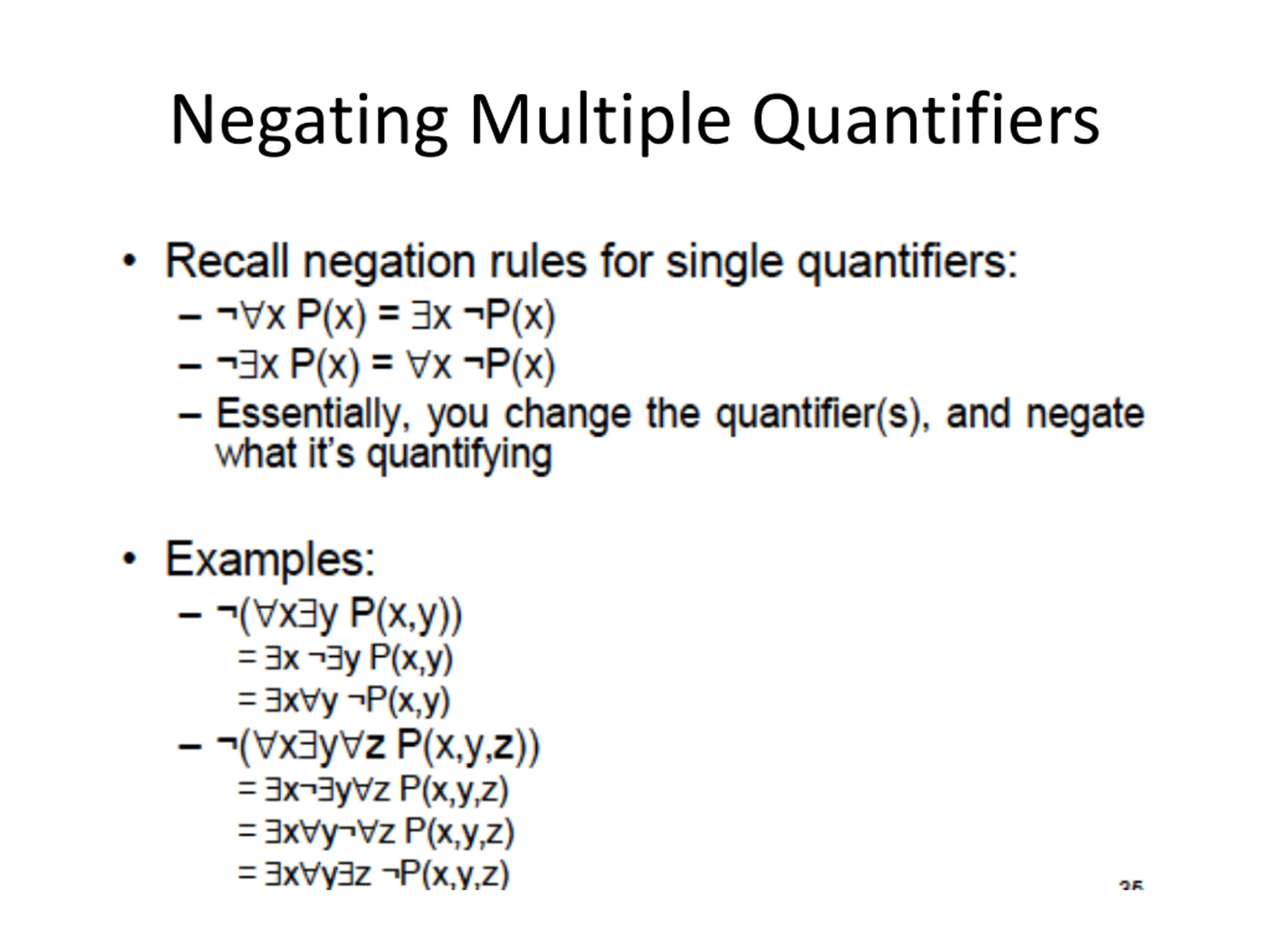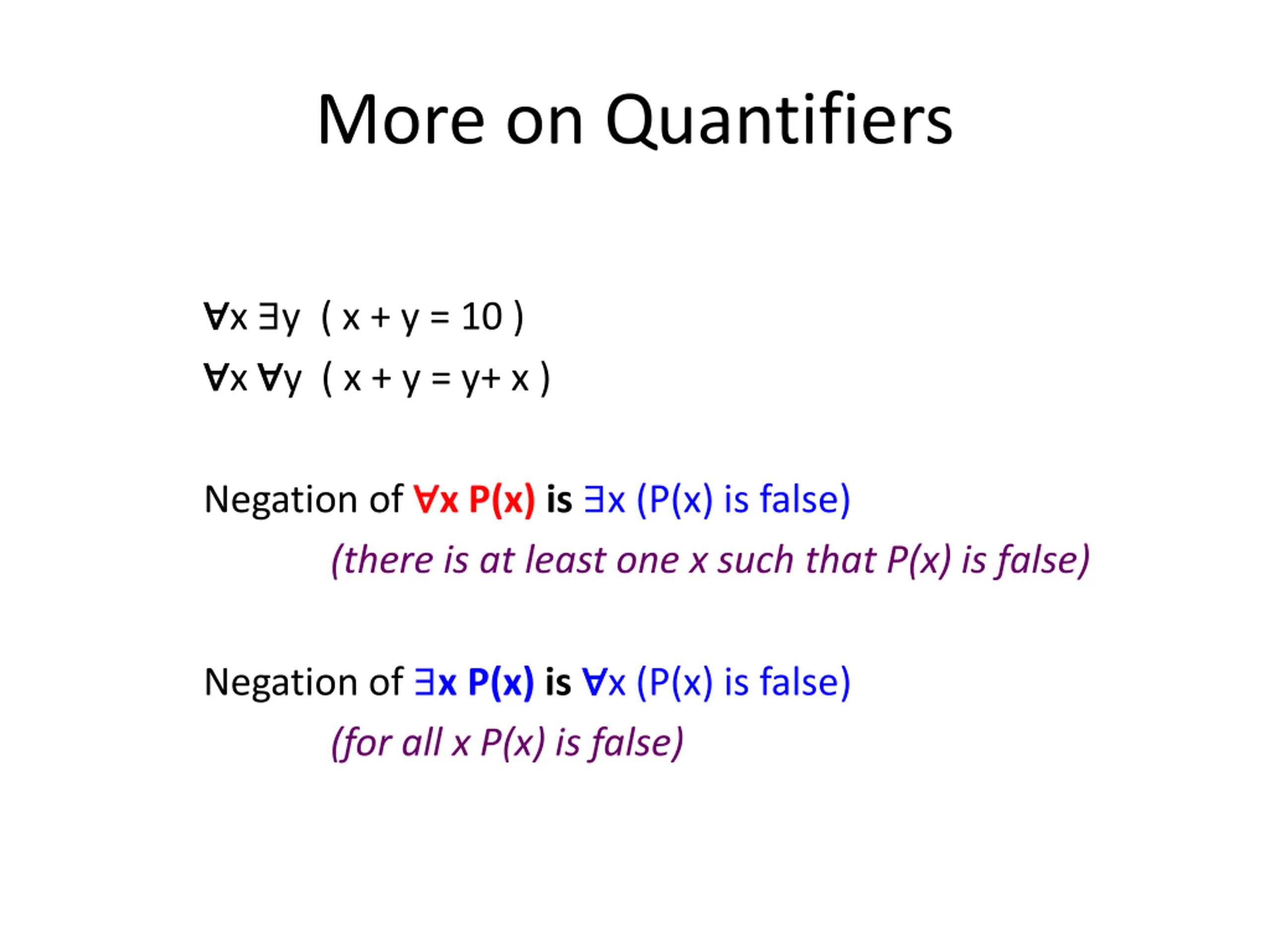 More on Quantifiers x y ( x + y = 10 ) x y ( x + y = y+ x ) Negation of x P(x) is x (P(x) is false) (there is at least one x such that P(x) is false) Negation of x P(x) is x (P(x) is false) (for all x P(x) is false)