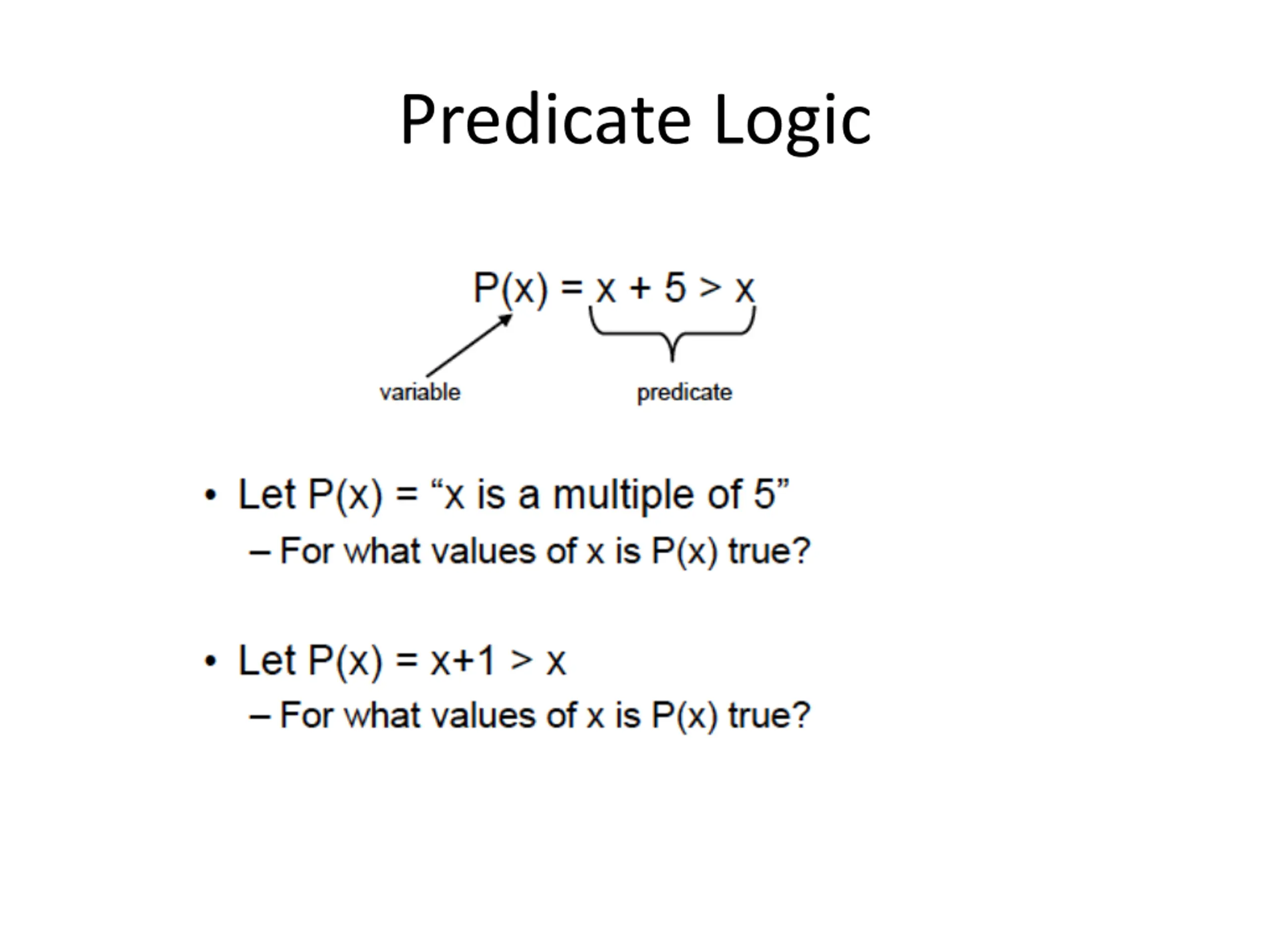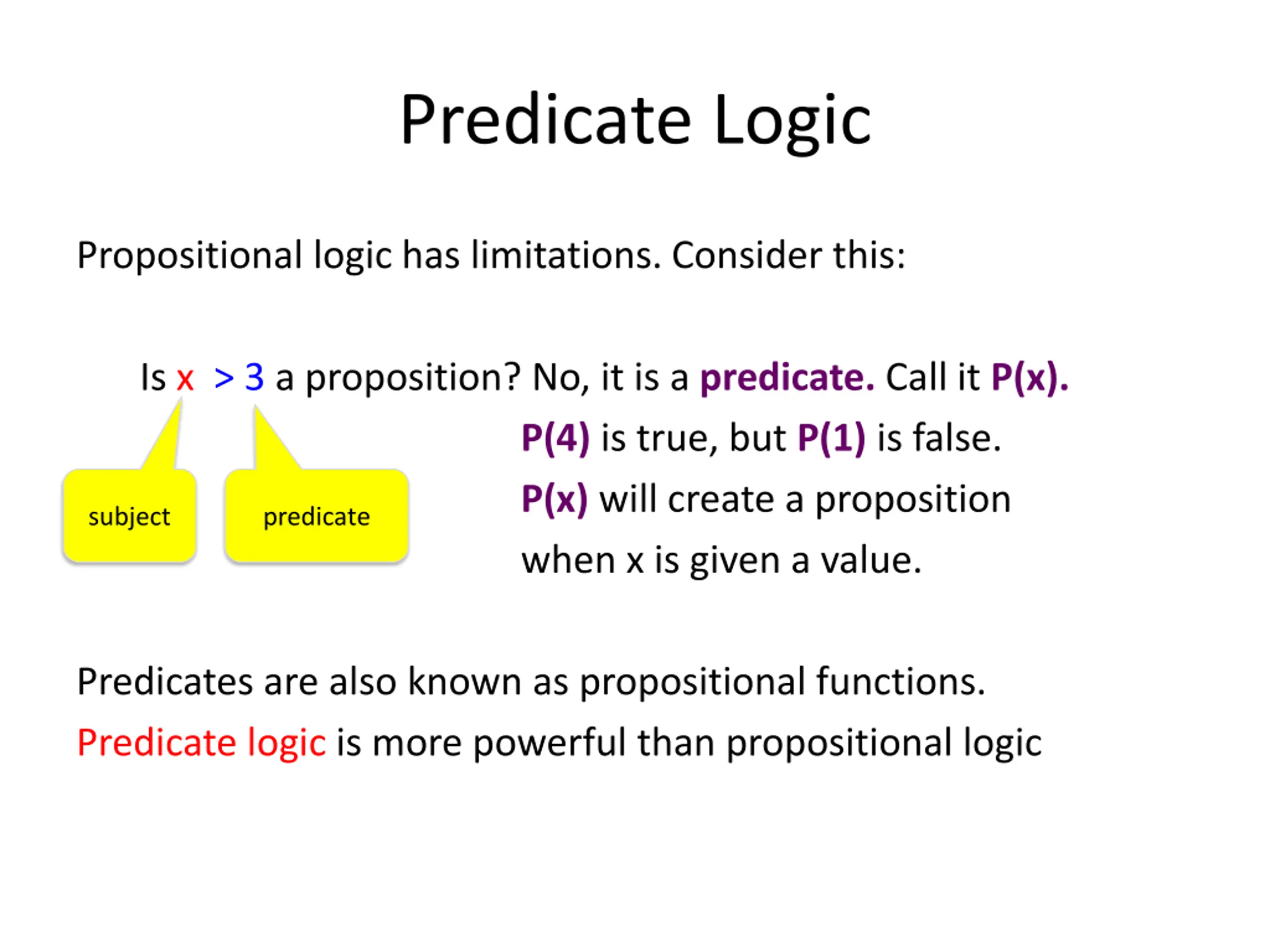 Predicate Logic Propositional logic has limitations. Consider this: Is x > 3 a proposition? No, it is a predicate. Call it P(x). P(4) is true, but P(1) is false. P(x) will create a proposition when x is given a value. subject predicate Predicates are also known as propositional functions. Predicate logic is more powerful than propositional logic