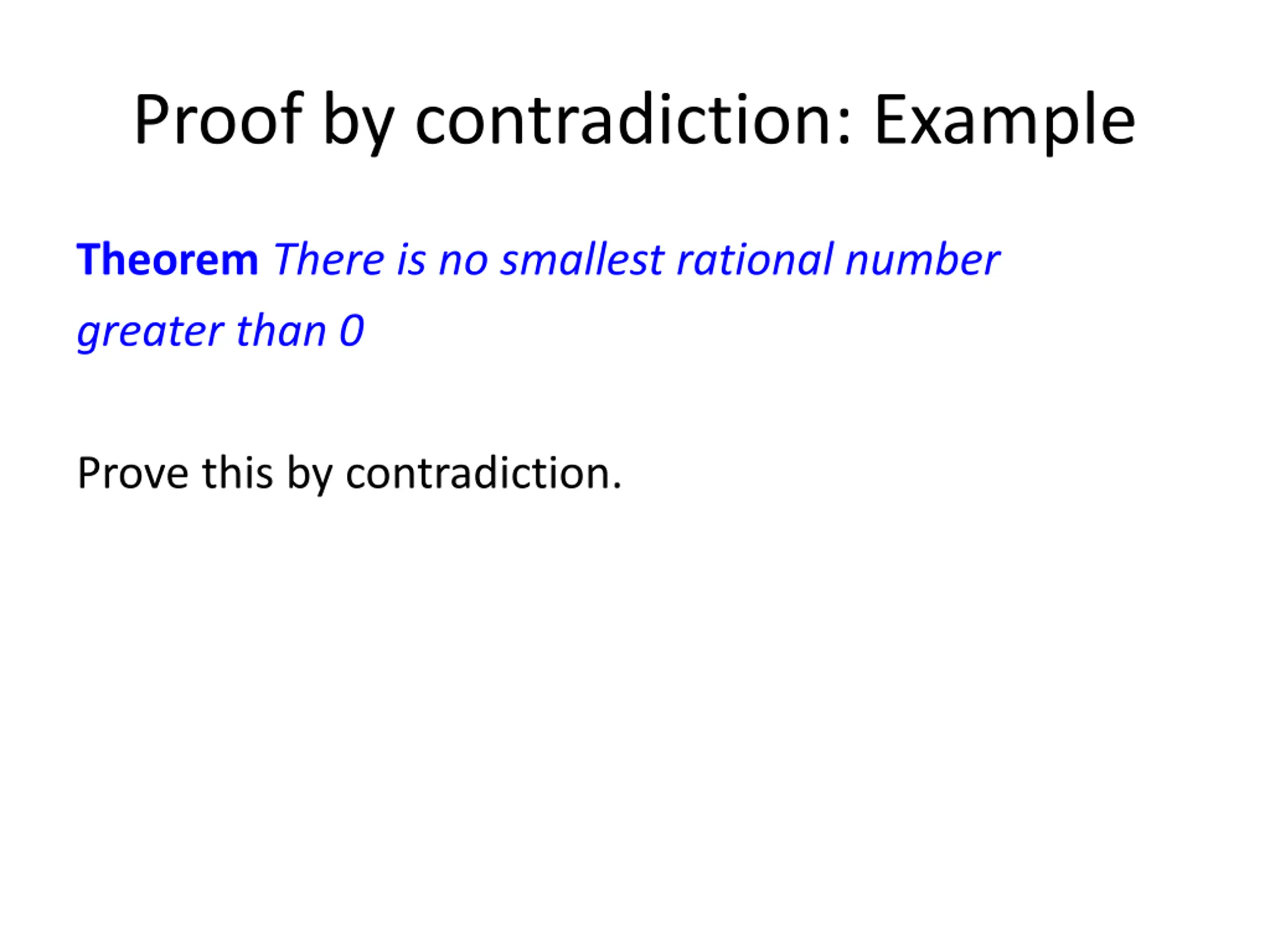 Proof by contradiction: Example Theorem There is no smallest rational number greater than 0 Prove this by contradiction.