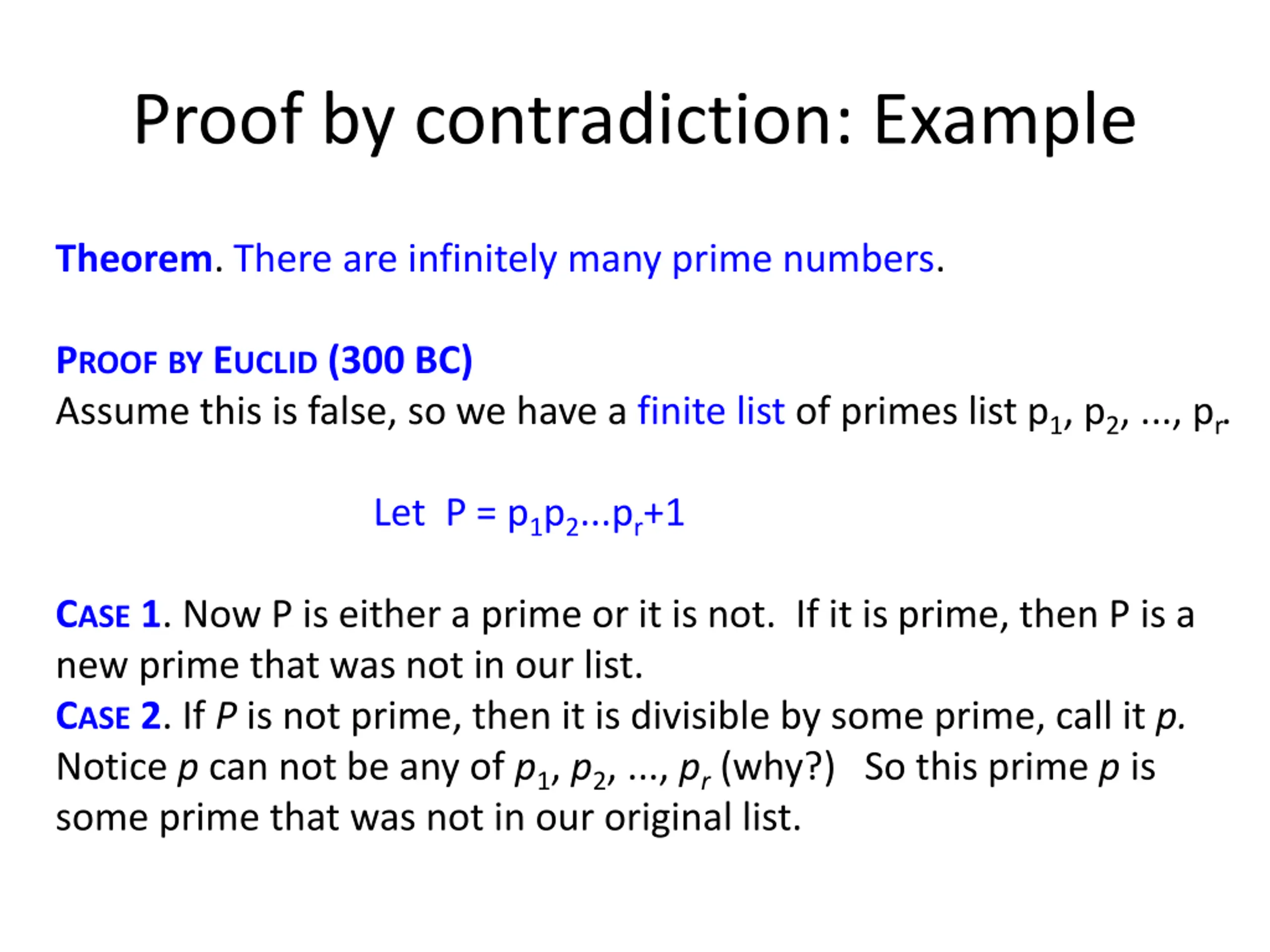 Proof by contradiction: Example Theorem. There are infinitely many prime numbers. PROOFBY EUCLID (300 BC) Assume this is false, so we have a finite list of primes list p1, p2, ..., pr. Let P = p1p2...pr+1 CASE 1. Now P is either a prime or it is not. If it is prime, then P is a new prime that was not in our list. CASE 2. If P is not prime, then it is divisible by some prime, call it p. Notice p can not be any of p1, p2, ..., pr (why?) So this prime p is some prime that was not in our original list.