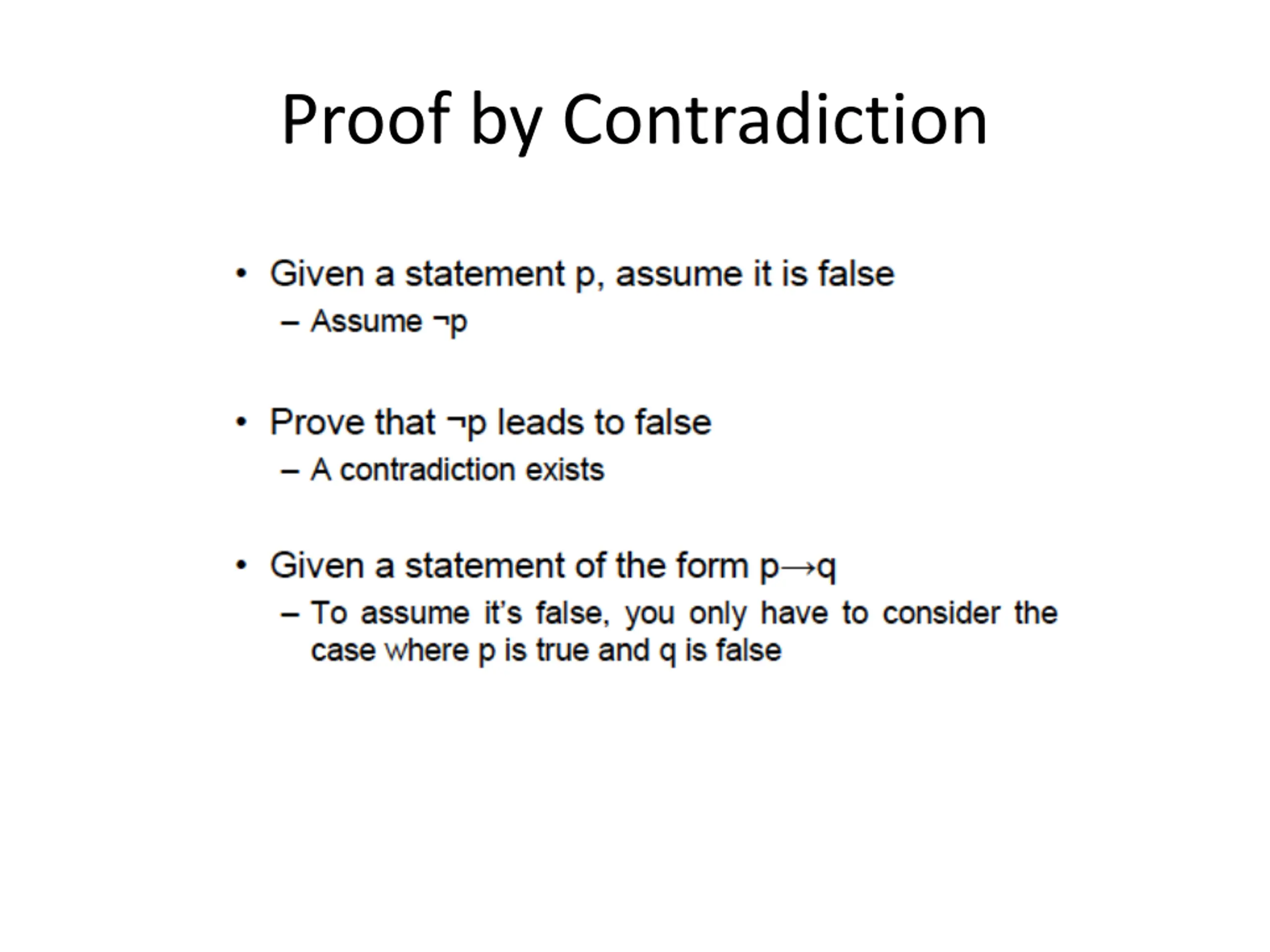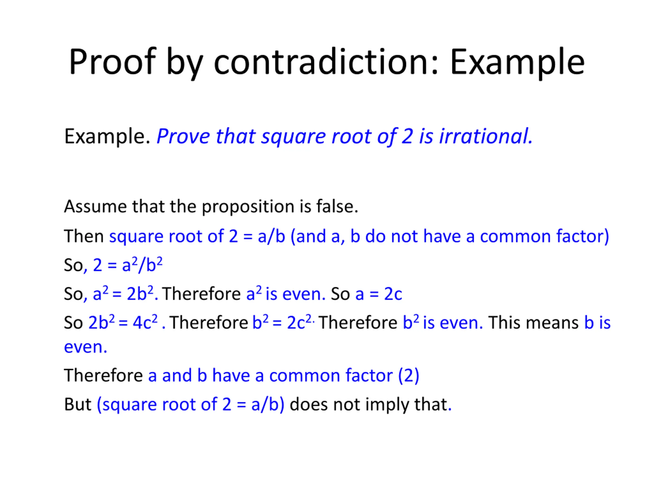 Proof by contradiction: Example Example. Prove that square root of 2 is irrational. Assume that the proposition is false. Then square root of 2 = a/b (and a, b do not have a common factor) So, 2 = a2/b2 So, a2 = 2b2.Therefore a2 is even. So a = 2c So 2b2 = 4c2 .Thereforeb2 = 2c2. Therefore b2 is even. This means b is even. Therefore a and b have a common factor (2) But (square root of 2 = a/b) does not imply that.