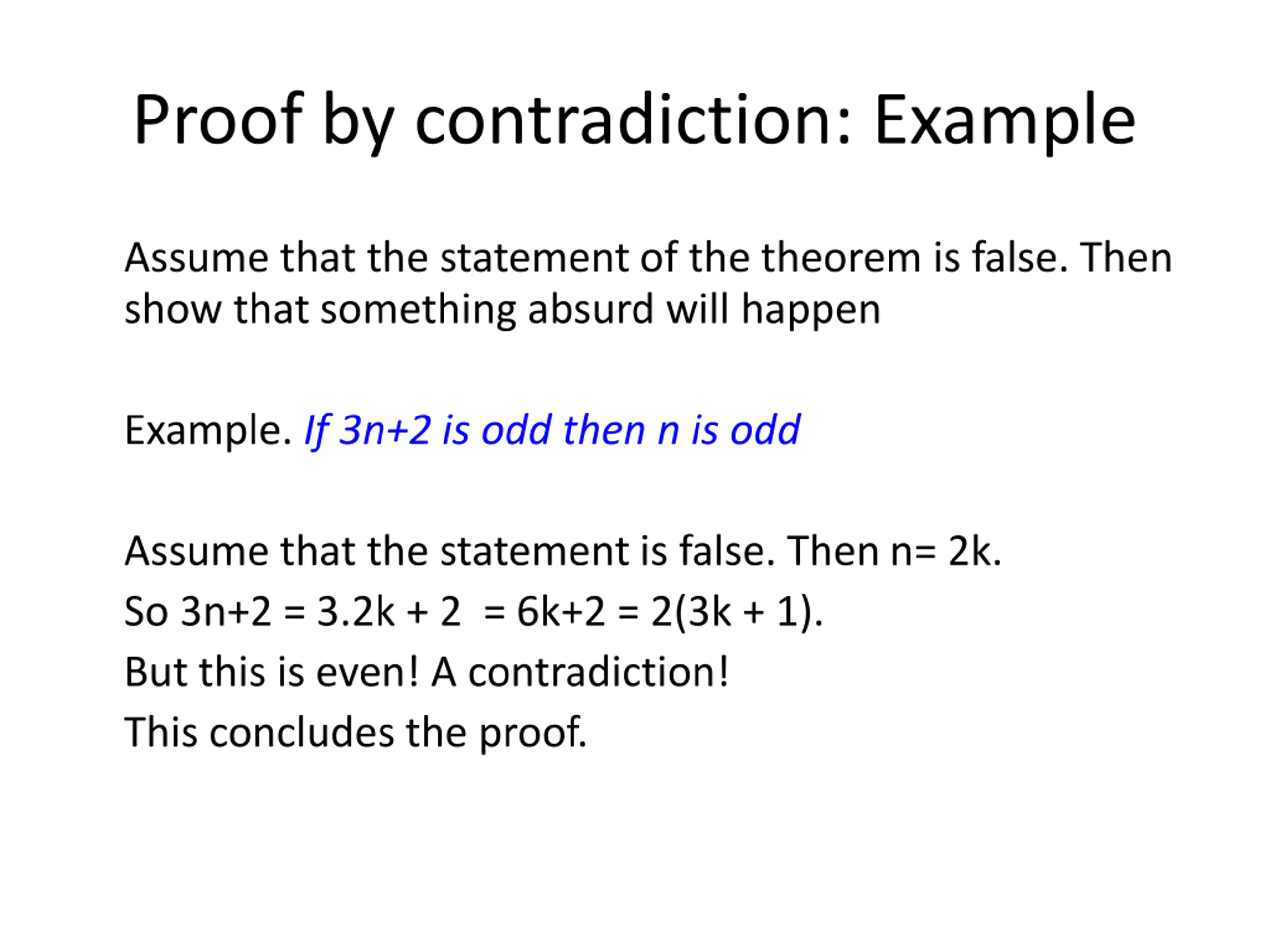 Proof by contradiction: Example Assume that the statement of the theorem is false. Then show that something absurd will happen Example. If 3n+2 is odd then n is odd Assume that the statement is false. Then n= 2k. So 3n+2 = 3.2k + 2 = 6k+2 = 2(3k + 1). But this is even! A contradiction! This concludes the proof.
