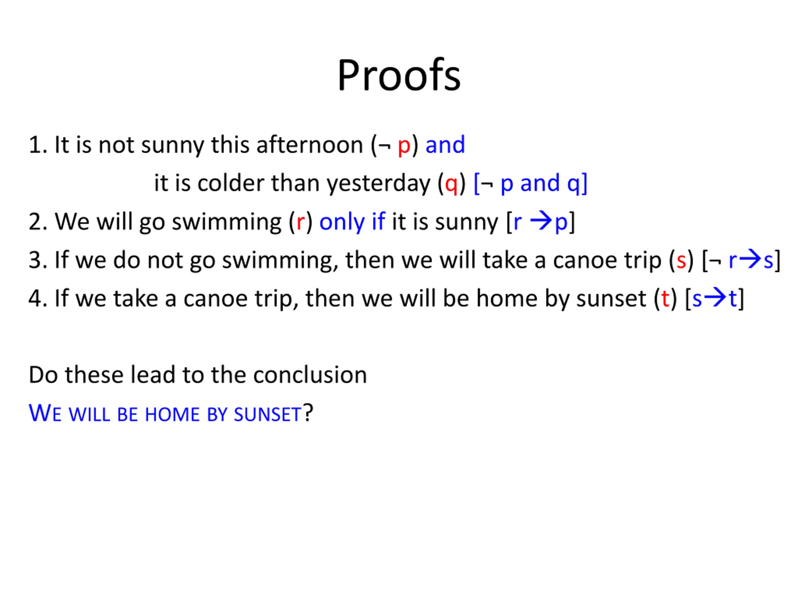 Proofs 1. It is not sunny this afternoon ( p) and it is colder than yesterday (q) [ p and q] 2. We will go swimming (r) only if it is sunny [r p] 3. If we do not go swimming, then we will take a canoe trip (s) [ r s] 4. If we take a canoe trip, then we will be home by sunset (t) [s t] Do these lead to the conclusion WEWILLBEHOMEBYSUNSET?