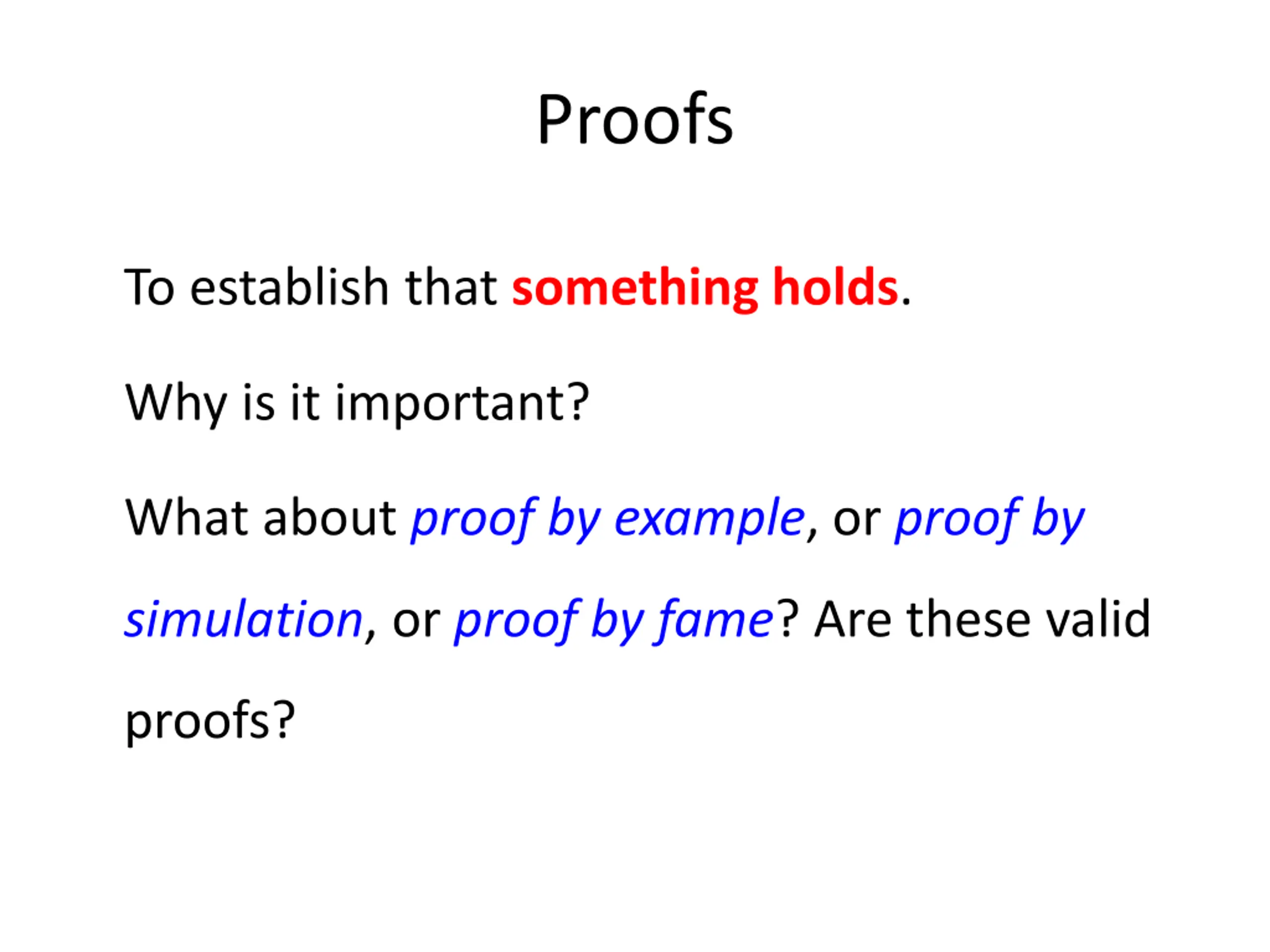 Proofs To establish that something holds. Why is it important? What about proof by example, or proof by simulation, or proof by fame? Are these valid proofs?