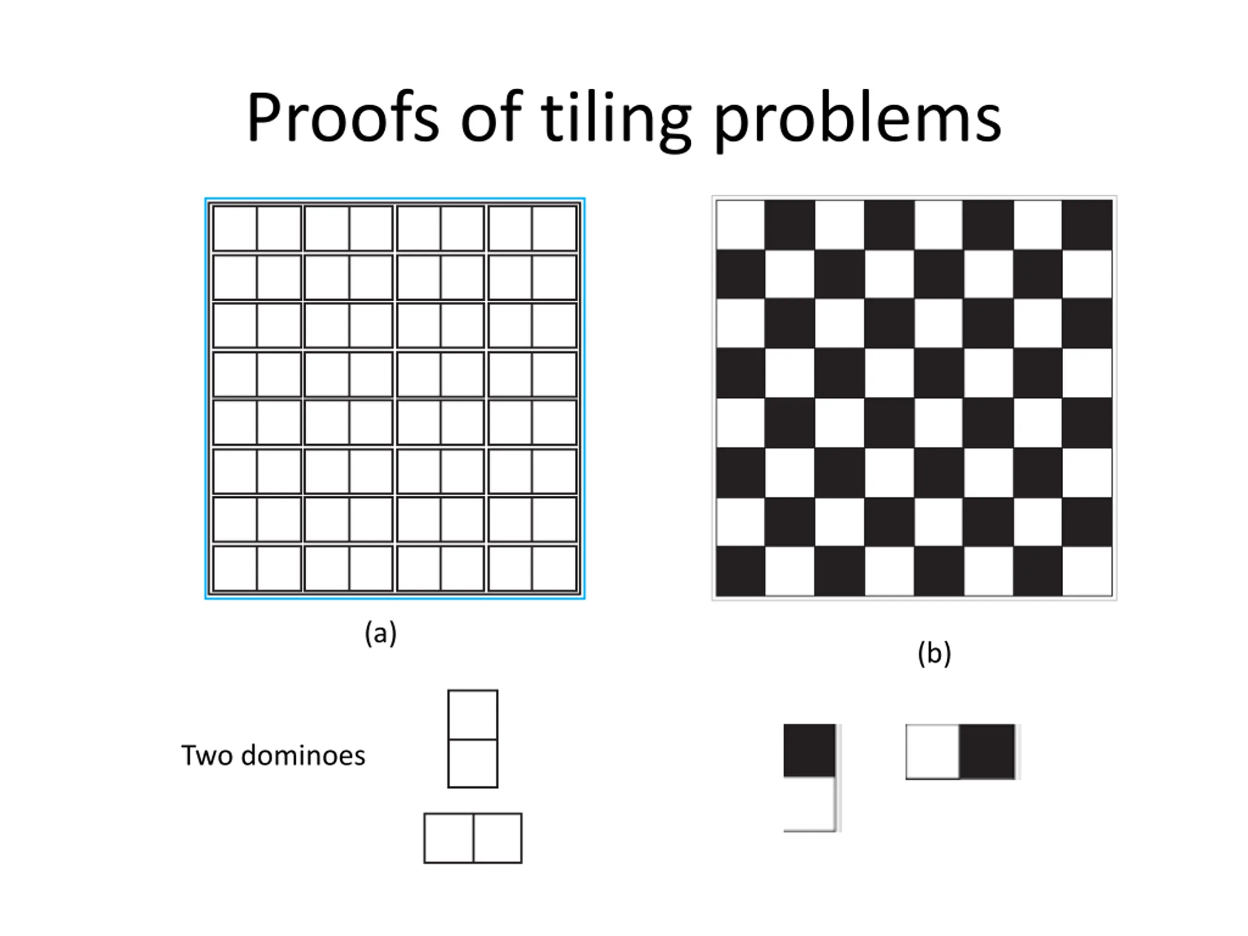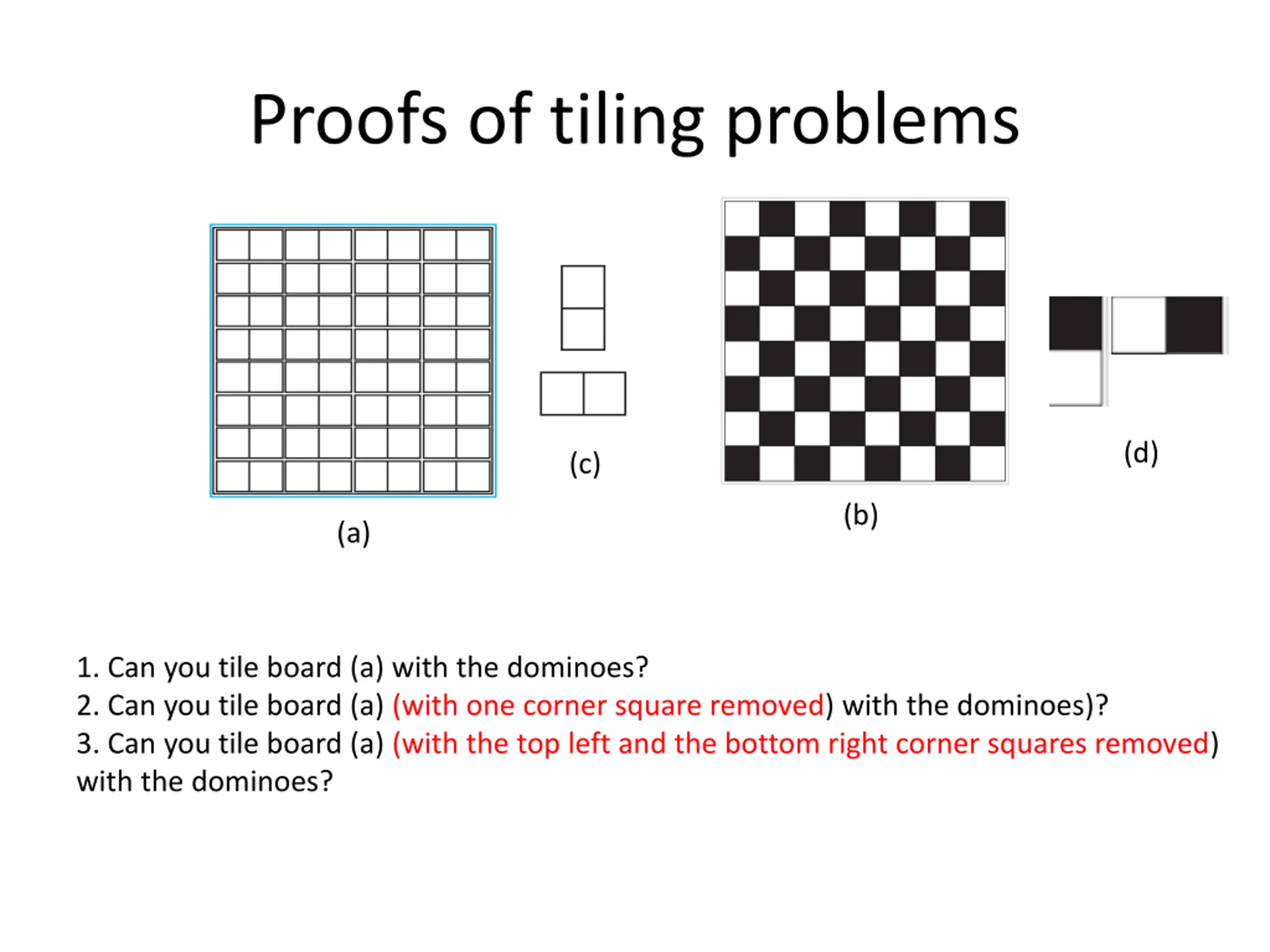 Proofs of tiling problems (d) (c) (b) (a) 1. Can you tile board (a) with the dominoes? 2. Can you tile board (a) (with one corner square removed) with the dominoes)? 3. Can you tile board (a) (with the top left and the bottom right corner squares removed) with the dominoes?