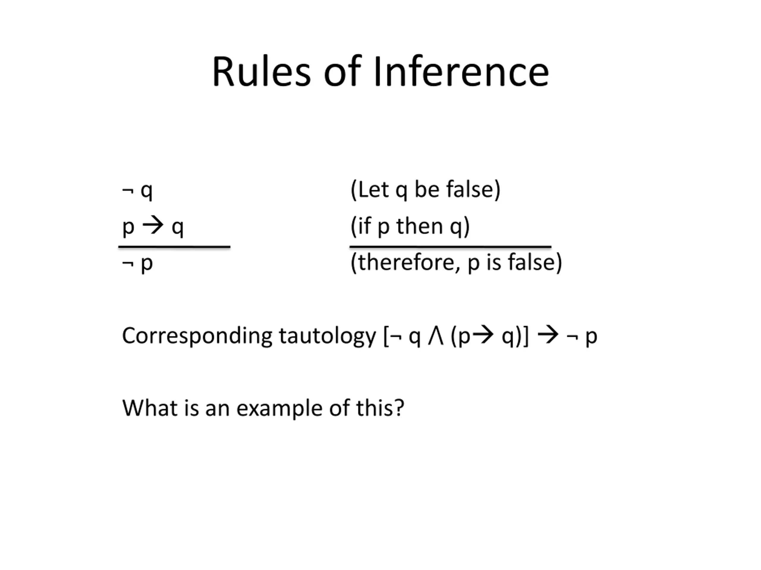 Rules of Inference q p q p (Let q be false) (if p then q) (therefore, p is false) Corresponding tautology [ q (p q)] p What is an example of this?