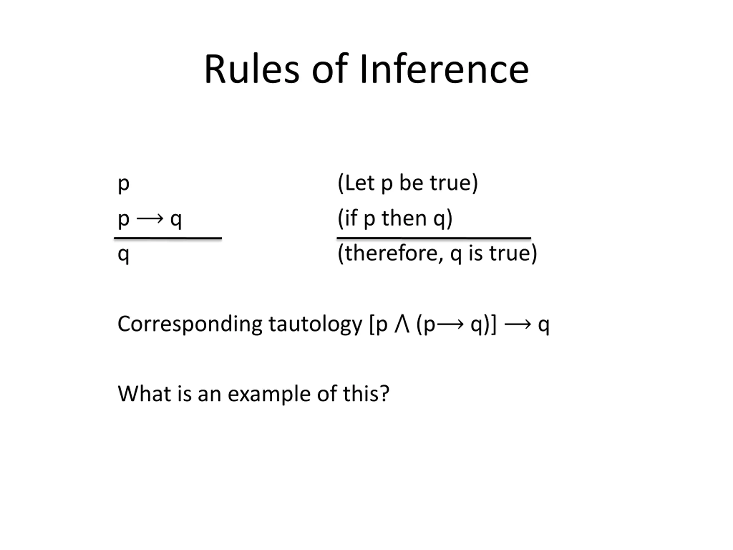 Rules of Inference p p q q (Let p be true) (if p then q) (therefore, q is true) Corresponding tautology [p (p q)] q What is an example of this?