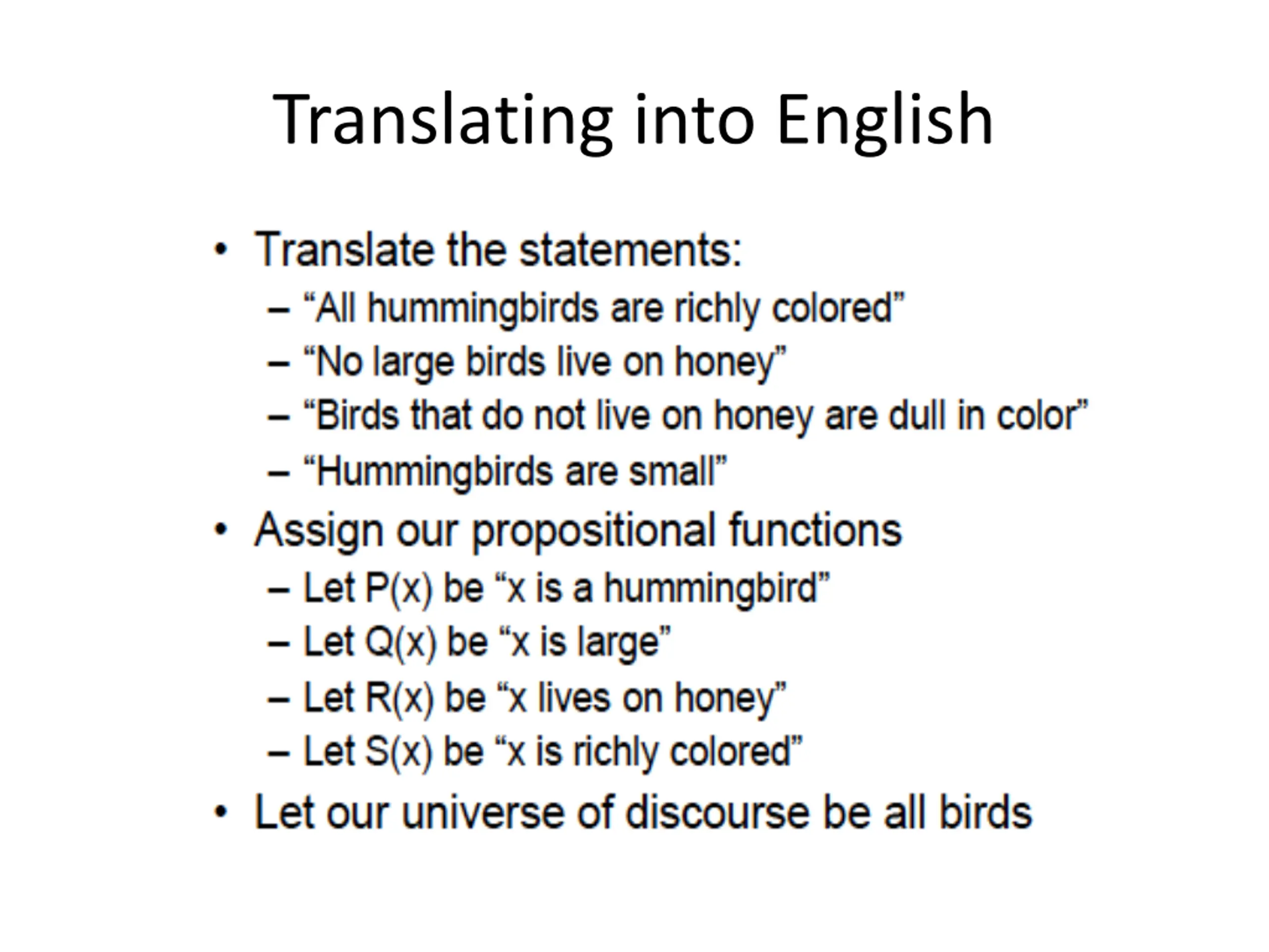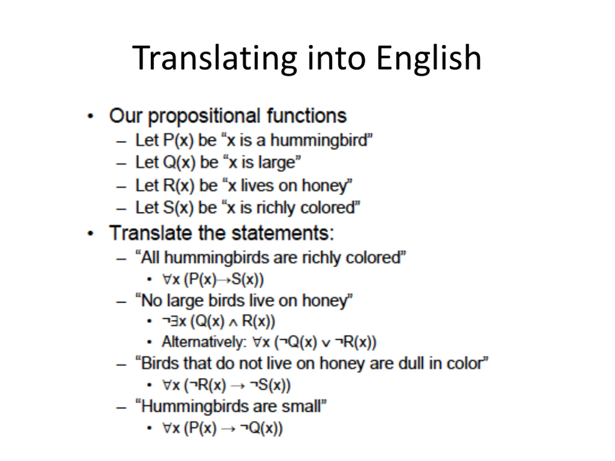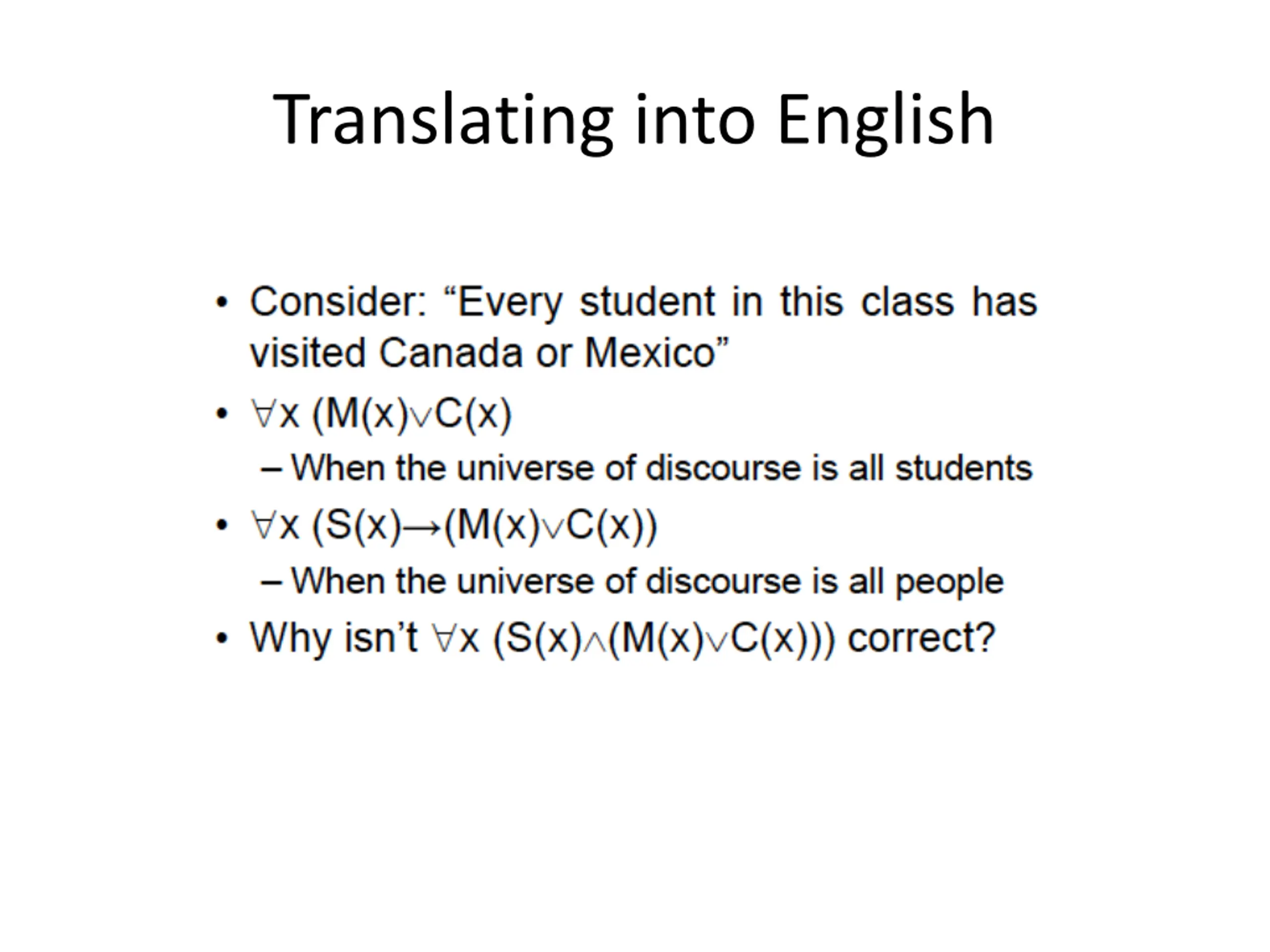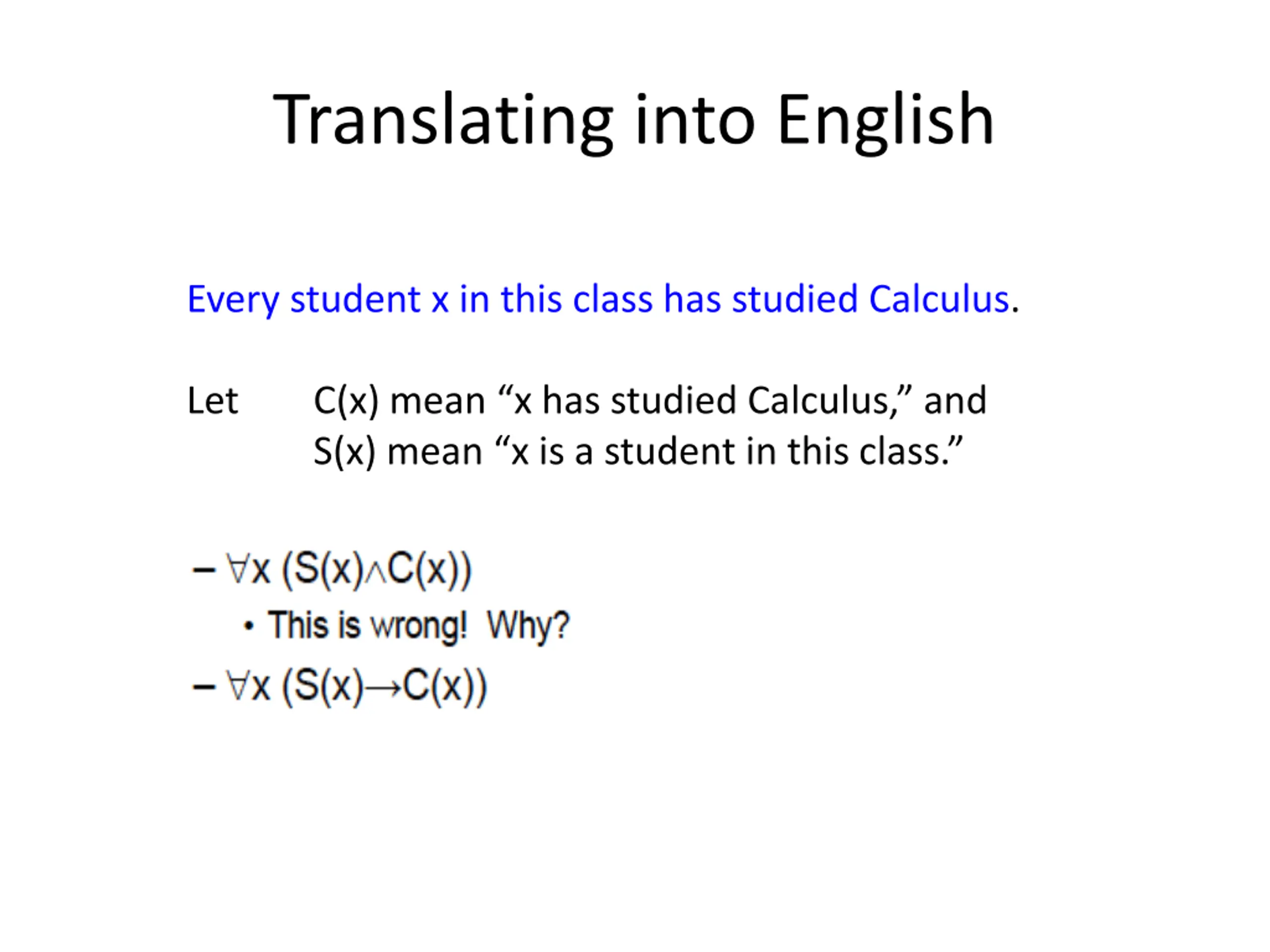 Translating into English Every student x in this class has studied Calculus. Let C(x) mean x has studied Calculus, and S(x) mean x is a student in this class.
