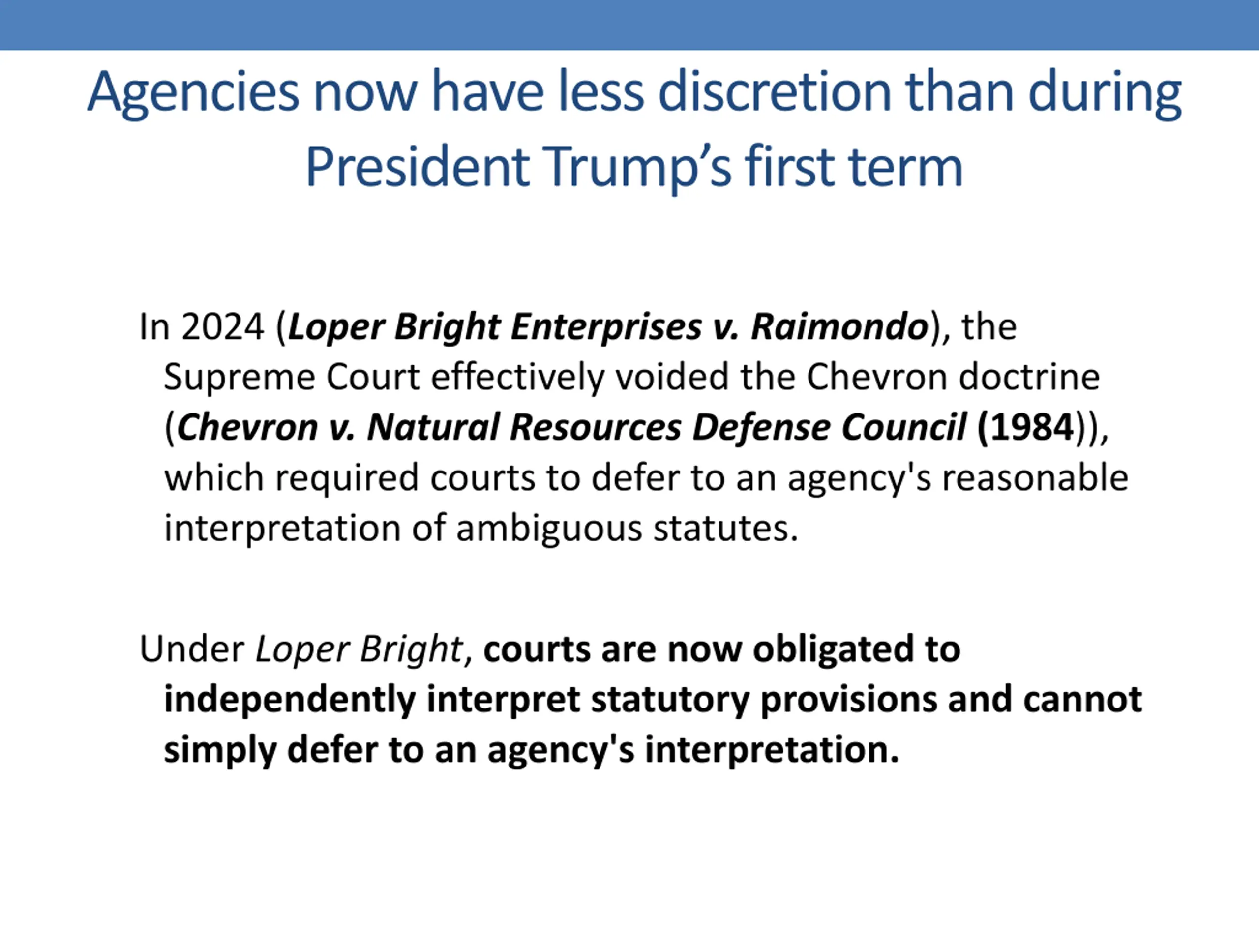 Agencies now have less discretion than during President Trump s first term In 2024 (Loper Bright Enterprises v. Raimondo), the Supreme Court effectively voided the Chevron doctrine (Chevron v. Natural Resources Defense Council (1984)), which required courts to defer to an agency's reasonable interpretation of ambiguous statutes. Under Loper Bright, courts are now obligated to independently interpret statutory provisions and cannot simply defer to an agency's interpretation.