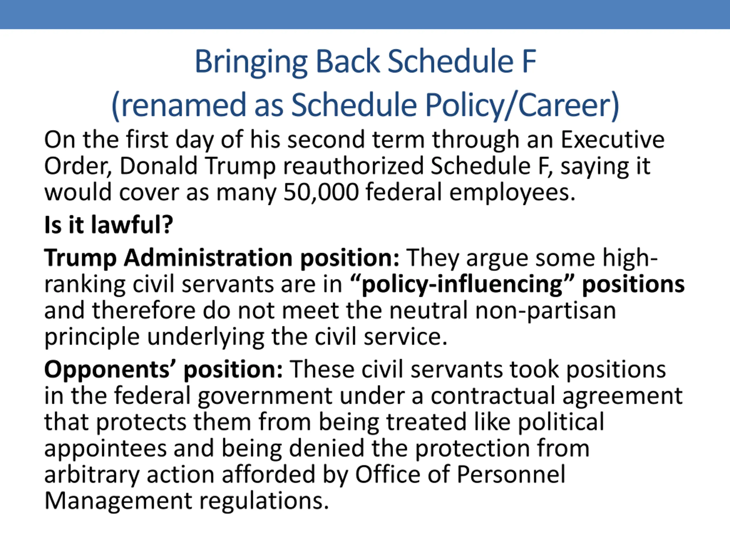 Bringing Back Schedule F (renamed as Schedule Policy/Career) On the first day of his second term through an Executive Order, Donald Trump reauthorized Schedule F, saying it would cover as many 50,000 federal employees. Is it lawful? Trump Administration position: They argue somehigh- ranking civil servants are in policy-influencing positions and therefore do not meet the neutral non-partisan principle underlying the civil service. Opponents position: These civil servants took positions in the federal government under a contractual agreement that protects them from being treated like political appointees and being denied the protection from arbitrary action afforded by Office of Personnel Management regulations.