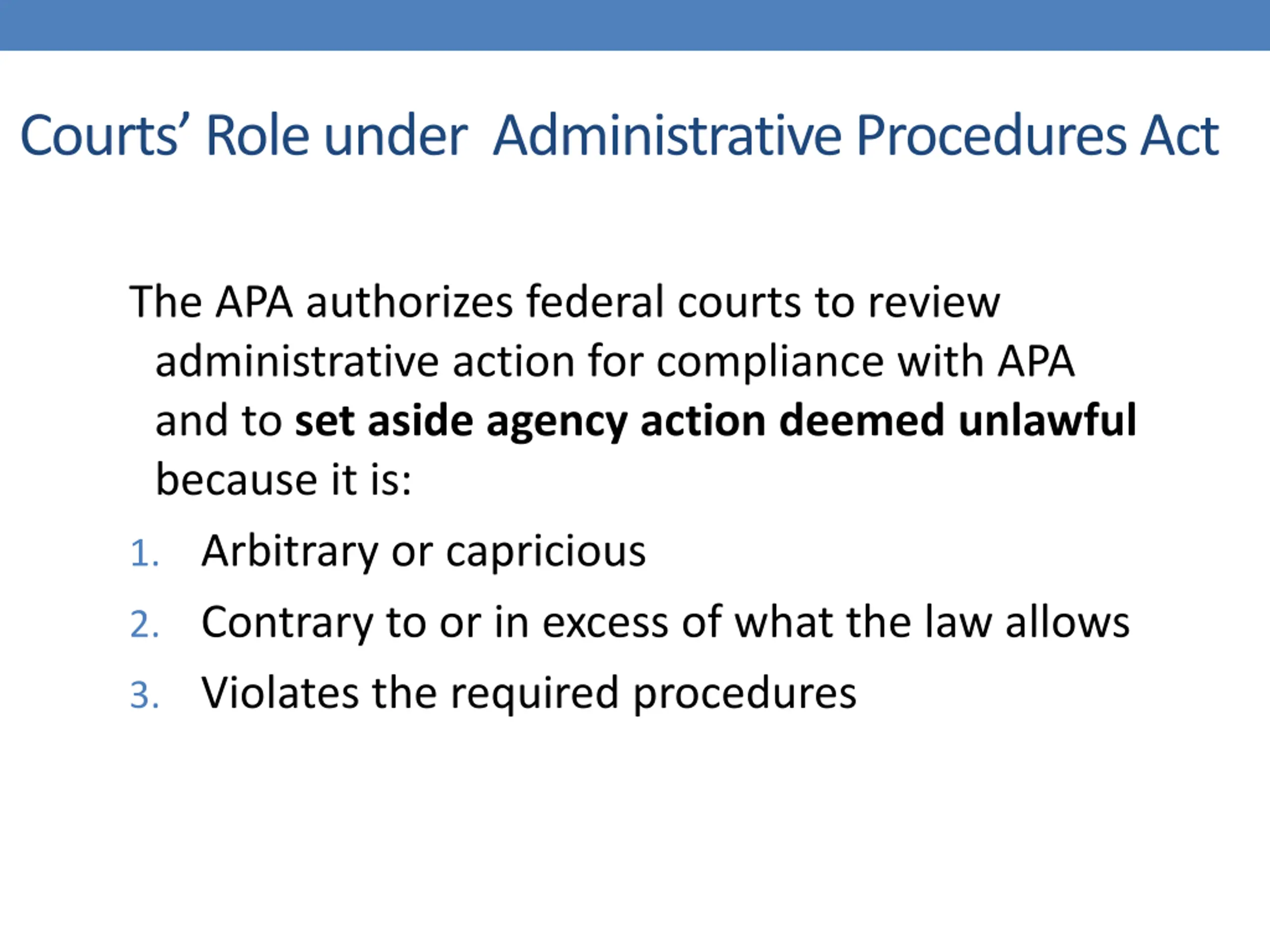 Courts Role under Administrative Procedures Act The APA authorizes federal courts to review administrative action for compliance with APA and to set aside agency action deemed unlawful because it is: 1. Arbitrary or capricious 2. Contrary to or in excess of what the law allows 3. Violates the required procedures