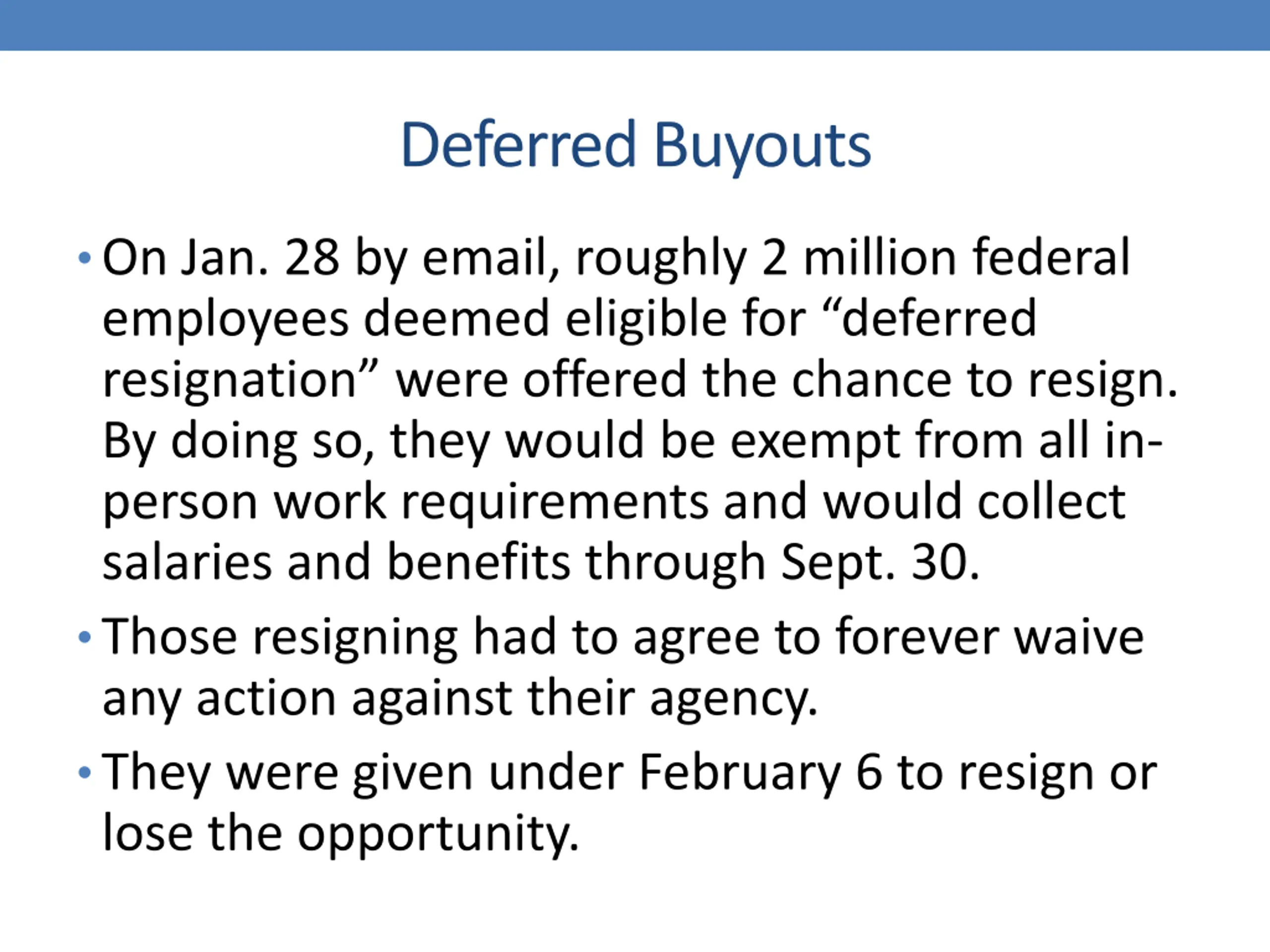 Deferred Buyouts On Jan. 28 by email, roughly 2 million federal employees deemed eligible for deferred resignation were offered the chance to resign. By doing so, they would be exempt from all in- person work requirements and would collect salaries and benefits through Sept. 30. Those resigning had to agree to forever waive any action against their agency. They were given under February 6 to resign or lose the opportunity.
