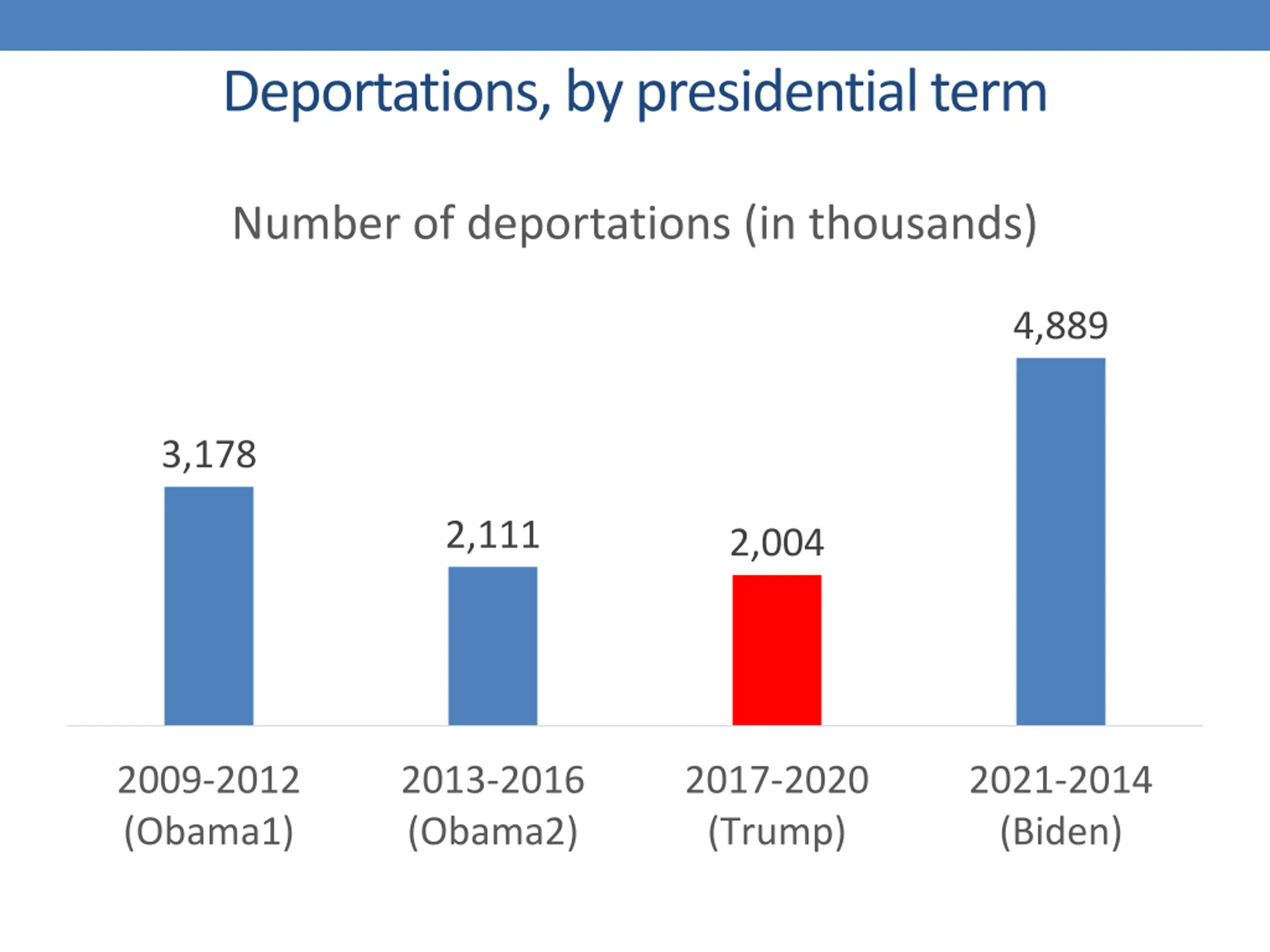 Deportations, by presidential term Number of deportations (in thousands) 4,889 3,178 2,111 2,004 2009-2012 (Obama1) 2013-2016 (Obama2) 2017-2020 (Trump) 2021-2014 (Biden)