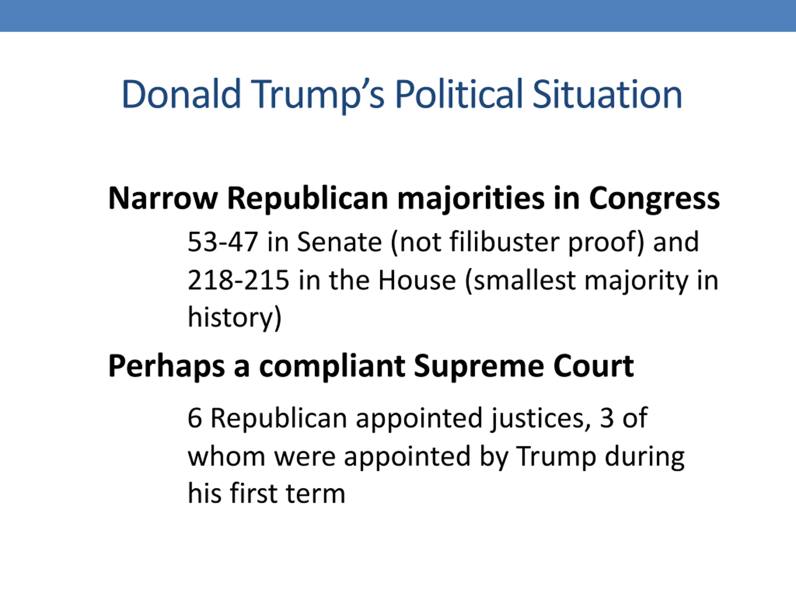 Donald Trumps Political Situation Narrow Republican majorities in Congress 53-47 in Senate (not filibuster proof) and 218-215 in the House (smallest majority in history) Perhaps a compliant Supreme Court 6 Republican appointed justices, 3 of whom were appointed by Trump during his first term
