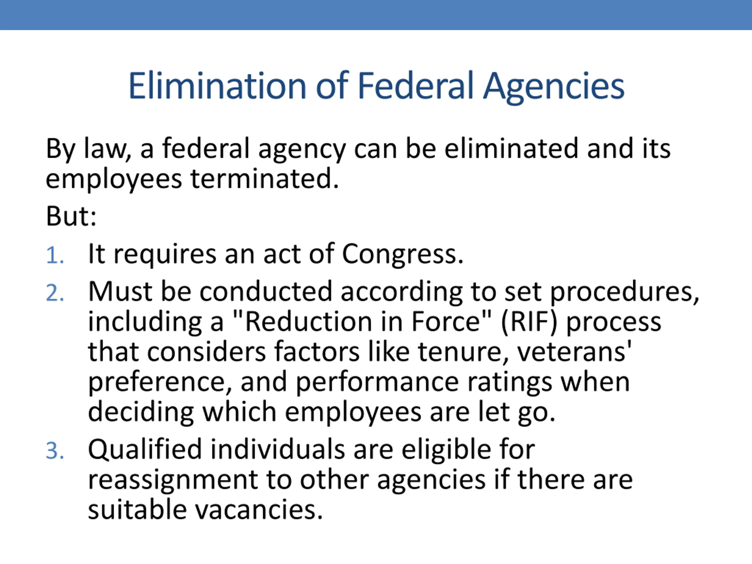 Elimination of Federal Agencies By law, a federal agency can be eliminated and its employees terminated. But: 1. It requires an act of Congress. 2. Must be conducted according to set procedures, including a "Reduction in Force" (RIF) process that considers factors like tenure, veterans' preference, and performance ratings when deciding which employees are let go. 3. Qualified individuals are eligible for reassignment to other agencies if there are suitable vacancies.