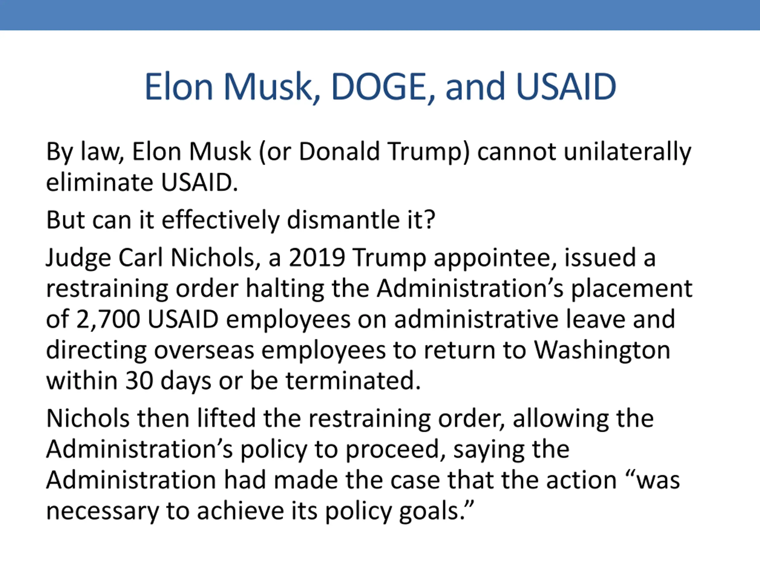 Elon Musk, DOGE, and USAID By law, Elon Musk (or Donald Trump) cannot unilaterally eliminate USAID. But can it effectively dismantle it? Judge Carl Nichols, a 2019 Trump appointee, issued a restraining order halting the Administration s placement of 2,700 USAID employees on administrative leave and directing overseas employees to return to Washington within 30 days or be terminated. Nichols then lifted the restraining order, allowing the Administration s policy to proceed, saying the Administration had made the case that the action was necessary to achieve its policy goals.