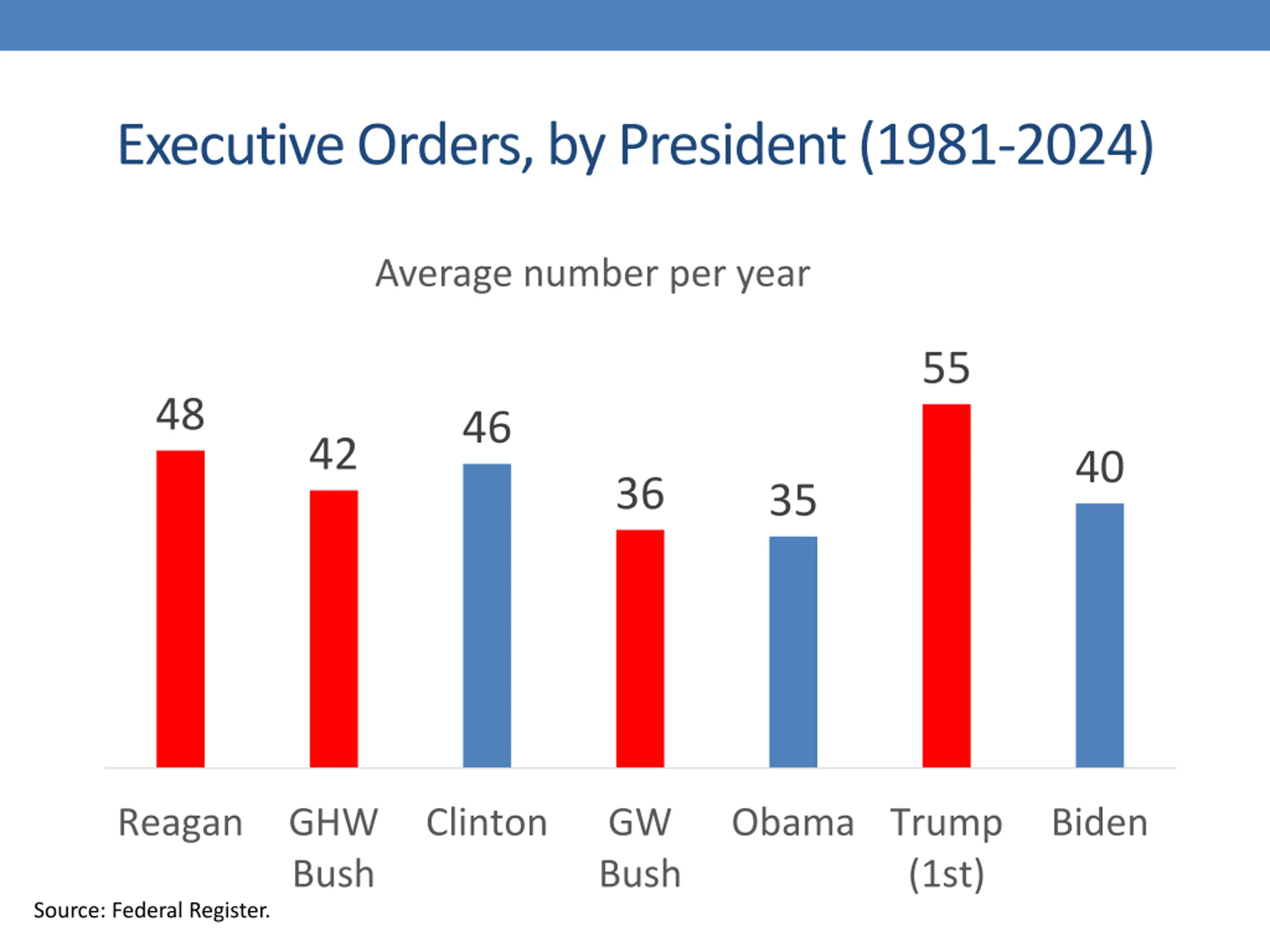 Executive Orders, by President (1981-2025) Average number per year (except Trump2 as of 3/3/2025) 82 55 48 46 42 40 36 35 Source: Federal Register. Number for Trump2 does not include Presidential Memorandum. Most of Trump s orders regarding staff freezes and cutbacks have been in the form of Memorandum,